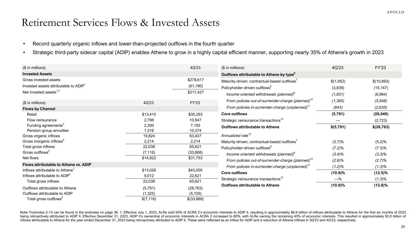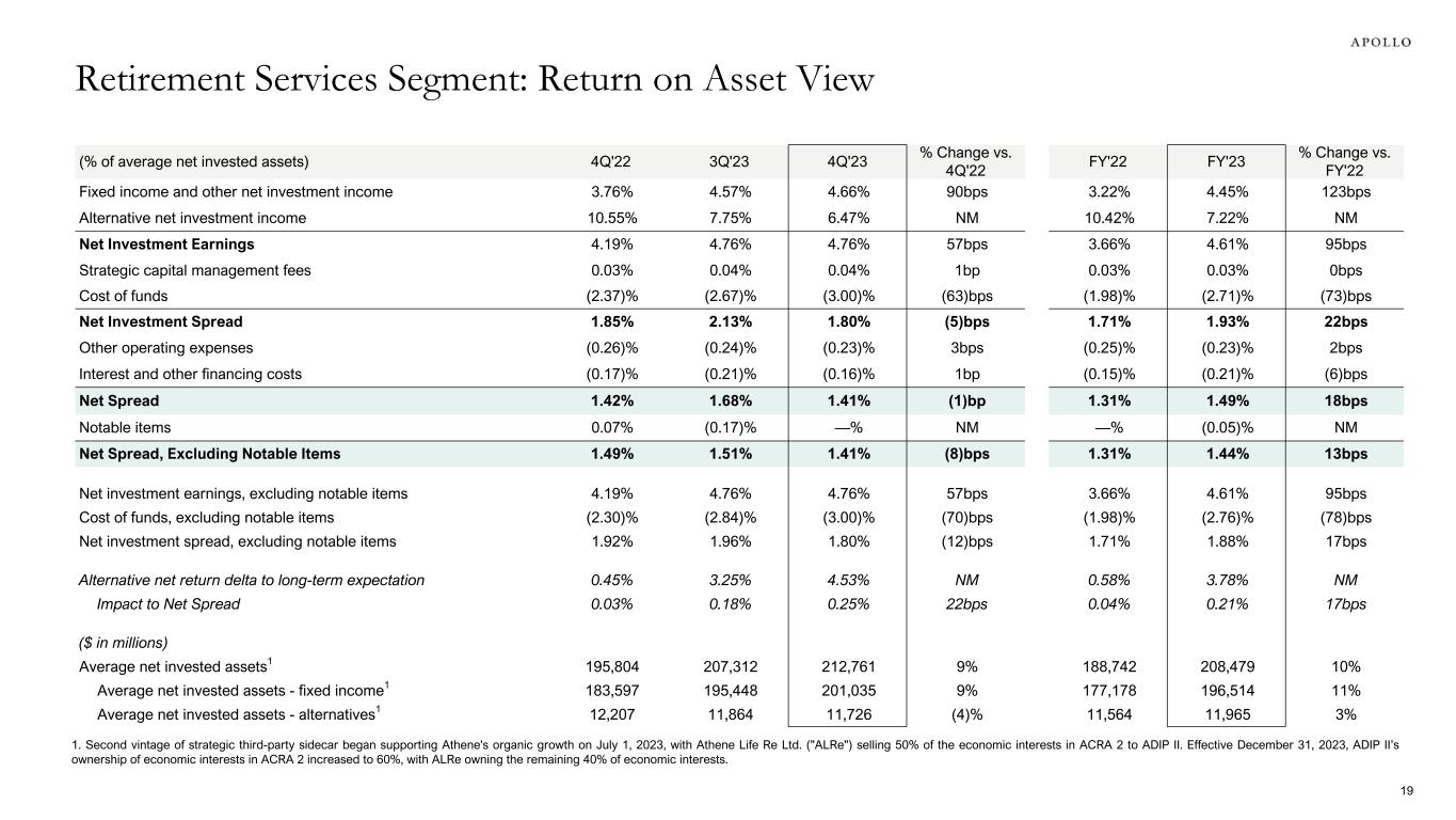 (% of average net invested assets) 4Q'22 3Q'23 4Q'23 % Change vs. 4Q'22 FY'22 FY'23 % Change vs. FY'22 Fixed income and other net investment income 3.76% 4.57% 4.66% 90bps 3.22% 4.45% 123bps Alternative net investment income 10.55% 7.75% 6.47% NM 10.42% 7.22% NM Net Investment Earnings 4.19% 4.76% 4.76% 57bps 3.66% 4.61% 95bps Strategic capital management fees 0.03% 0.04% 0.04% 1bp 0.03% 0.03% 0bps Cost of funds (2.37)% (2.67)% (3.00)% (63)bps (1.98)% (2.71)% (73)bps Net Investment Spread 1.85% 2.13% 1.80% (5)bps 1.71% 1.93% 22bps Other operating expenses (0.26)% (0.24)% (0.23)% 3bps (0.25)% (0.23)% 2bps Interest and other financing costs (0.17)% (0.21)% (0.16)% 1bp (0.15)% (0.21)% (6)bps Net Spread 1.42% 1.68% 1.41% (1)bp 1.31% 1.49% 18bps Notable items 0.07% (0.17)% —% NM —% (0.05)% NM Net Spread, Excluding Notable Items 1.49% 1.51% 1.41% (8)bps 1.31% 1.44% 13bps Net investment earnings, excluding notable items 4.19% 4.76% 4.76% 57bps 3.66% 4.61% 95bps Cost of funds, excluding notable items (2.30)% (2.84)% (3.00)% (70)bps (1.98)% (2.76)% (78)bps Net investment spread, excluding notable items 1.92% 1.96% 1.80% (12)bps 1.71% 1.88% 17bps Alternative net return delta to long-term expectation 0.45% 3.25% 4.53% NM 0.58% 3.78% NM Impact to Net Spread 0.03% 0.18% 0.25% 22bps 0.04% 0.21% 17bps ($ in millions) Average net invested assets1 195,804 207,312 212,761 9% 188,742 208,479 10% Average net invested assets - fixed income1 183,597 195,448 201,035 9% 177,178 196,514 11% Average net invested assets - alternatives1 12,207 11,864 11,726 (4)% 11,564 11,965 3% Retirement Services Segment: Return on Asset View 1. Second vintage of strategic third-party sidecar began supporting Athene's organic growth on July 1, 2023, with Athene Life Re Ltd. ("ALRe") selling 50% of the economic interests in ACRA 2 to ADIP II. Effective December 31, 2023, ADIP II’s ownership of economic interests in ACRA 2 increased to 60%, with ALRe owning the remaining 40% of economic interests. 19