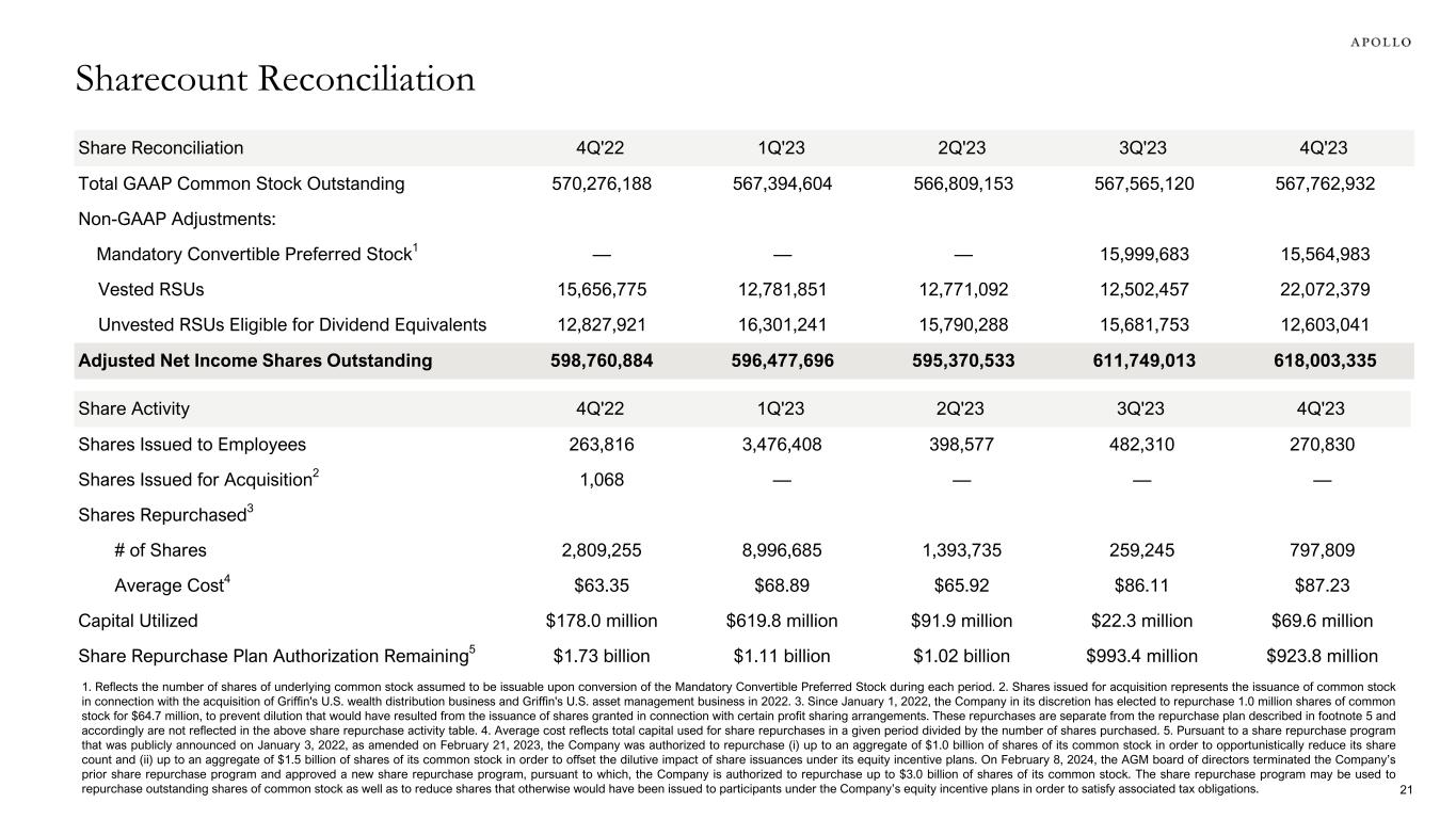 Share Reconciliation 4Q'22 1Q'23 2Q'23 3Q'23 4Q'23 Total GAAP Common Stock Outstanding 570,276,188 567,394,604 566,809,153 567,565,120 567,762,932 Non-GAAP Adjustments: Mandatory Convertible Preferred Stock1 — — — 15,999,683 15,564,983 Vested RSUs 15,656,775 12,781,851 12,771,092 12,502,457 22,072,379 Unvested RSUs Eligible for Dividend Equivalents 12,827,921 16,301,241 15,790,288 15,681,753 12,603,041 Adjusted Net Income Shares Outstanding 598,760,884 596,477,696 595,370,533 611,749,013 618,003,335 1. Reflects the number of shares of underlying common stock assumed to be issuable upon conversion of the Mandatory Convertible Preferred Stock during each period. 2. Shares issued for acquisition represents the issuance of common stock in connection with the acquisition of Griffin's U.S. wealth distribution business and Griffin's U.S. asset management business in 2022. 3. Since January 1, 2022, the Company in its discretion has elected to repurchase 1.0 million shares of common stock for $64.7 million, to prevent dilution that would have resulted from the issuance of shares granted in connection with certain profit sharing arrangements. These repurchases are separate from the repurchase plan described in footnote 5 and accordingly are not reflected in the above share repurchase activity table. 4. Average cost reflects total capital used for share repurchases in a given period divided by the number of shares purchased. 5. Pursuant to a share repurchase program that was publicly announced on January 3, 2022, as amended on February 21, 2023, the Company was authorized to repurchase (i) up to an aggregate of $1.0 billion of shares of its common stock in order to opportunistically reduce its share count and (ii) up to an aggregate of $1.5 billion of shares of its common stock in order to offset the dilutive impact of share issuances under its equity incentive plans. On February 8, 2024, the AGM board of directors terminated the Company’s prior share repurchase program and approved a new share repurchase program, pursuant to which, the Company is authorized to repurchase up to $3.0 billion of shares of its common stock. The share repurchase program may be used to repurchase outstanding shares of common stock as well as to reduce shares that otherwise would have been issued to participants under the Company’s equity incentive plans in order to satisfy associated tax obligations. Share Activity 4Q'22 1Q'23 2Q'23 3Q'23 4Q'23 Shares Issued to Employees 263,816 3,476,408 398,577 482,310 270,830 Shares Issued for Acquisition2 1,068 — — — — Shares Repurchased3 # of Shares 2,809,255 8,996,685 1,393,735 259,245 797,809 Average Cost4 $63.35 $68.89 $65.92 $86.11 $87.23 Capital Utilized $178.0 million $619.8 million $91.9 million $22.3 million $69.6 million Share Repurchase Plan Authorization Remaining5 $1.73 billion $1.11 billion $1.02 billion $993.4 million $923.8 million Sharecount Reconciliation 21