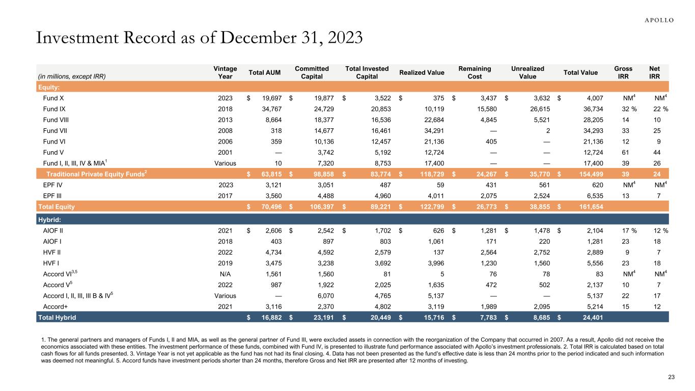 (in millions, except IRR) Vintage Year Total AUM Committed Capital Total Invested Capital Realized Value Remaining Cost Unrealized Value Total Value Gross IRR Net IRR Equity: Fund X 2023 $ 19,697 $ 19,877 $ 3,522 $ 375 $ 3,437 $ 3,632 $ 4,007 NM4 NM4 Fund IX 2018 34,767 24,729 20,853 10,119 15,580 26,615 36,734 32 % 22 % Fund VIII 2013 8,664 18,377 16,536 22,684 4,845 5,521 28,205 14 10 Fund VII 2008 318 14,677 16,461 34,291 — 2 34,293 33 25 Fund VI 2006 359 10,136 12,457 21,136 405 — 21,136 12 9 Fund V 2001 — 3,742 5,192 12,724 — — 12,724 61 44 Fund I, II, III, IV & MIA1 Various 10 7,320 8,753 17,400 — — 17,400 39 26 Traditional Private Equity Funds2 $ 63,815 $ 98,858 $ 83,774 $ 118,729 $ 24,267 $ 35,770 $ 154,499 39 24 EPF IV 2023 3,121 3,051 487 59 431 561 620 NM4 NM4 EPF III 2017 3,560 4,488 4,960 4,011 2,075 2,524 6,535 13 7 Total Equity $ 70,496 $ 106,397 $ 89,221 $ 122,799 $ 26,773 $ 38,855 $ 161,654 Hybrid: AIOF II 2021 $ 2,606 $ 2,542 $ 1,702 $ 626 $ 1,281 $ 1,478 $ 2,104 17 % 12 % AIOF I 2018 403 897 803 1,061 171 220 1,281 23 18 HVF II 2022 4,734 4,592 2,579 137 2,564 2,752 2,889 9 7 HVF I 2019 3,475 3,238 3,692 3,996 1,230 1,560 5,556 23 18 Accord VI3,5 N/A 1,561 1,560 81 5 76 78 83 NM4 NM4 Accord V5 2022 987 1,922 2,025 1,635 472 502 2,137 10 7 Accord I, II, III, III B & IV5 Various — 6,070 4,765 5,137 — — 5,137 22 17 Accord+ 2021 3,116 2,370 4,802 3,119 1,989 2,095 5,214 15 12 Total Hybrid $ 16,882 $ 23,191 $ 20,449 $ 15,716 $ 7,783 $ 8,685 $ 24,401 Investment Record as of December 31, 2023 23 1. The general partners and managers of Funds I, II and MIA, as well as the general partner of Fund III, were excluded assets in connection with the reorganization of the Company that occurred in 2007. As a result, Apollo did not receive the economics associated with these entities. The investment performance of these funds, combined with Fund IV, is presented to illustrate fund performance associated with Apollo’s investment professionals. 2. Total IRR is calculated based on total cash flows for all funds presented. 3. Vintage Year is not yet applicable as the fund has not had its final closing. 4. Data has not been presented as the fund’s effective date is less than 24 months prior to the period indicated and such information was deemed not meaningful. 5. Accord funds have investment periods shorter than 24 months, therefore Gross and Net IRR are presented after 12 months of investing.