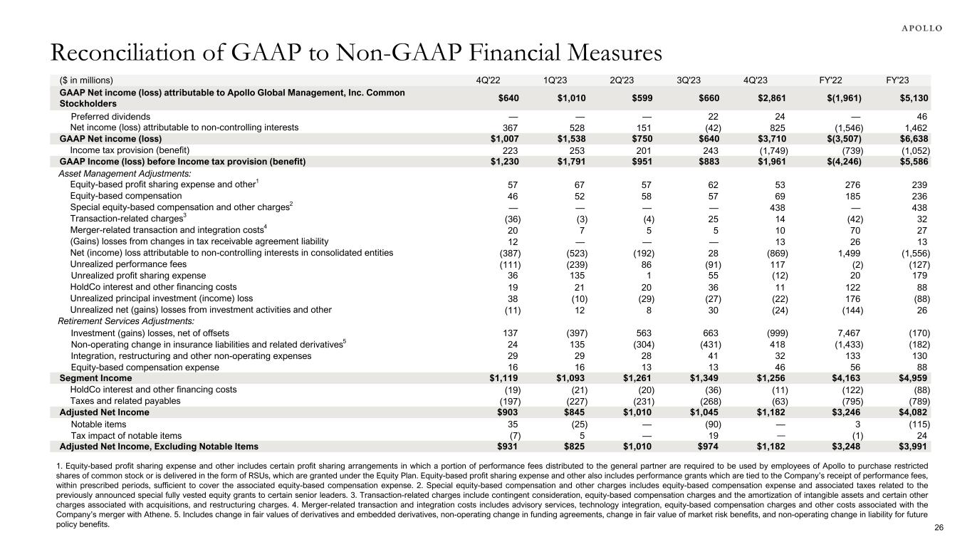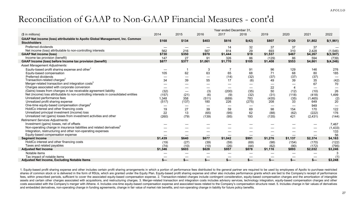 ($ in millions) 4Q'22 1Q'23 2Q'23 3Q'23 4Q'23 FY'22 FY'23 GAAP Net income (loss) attributable to Apollo Global Management, Inc. Common Stockholders $640 $1,010 $599 $660 $2,861 $(1,961) $5,130 Preferred dividends — — — 22 24 — 46 Net income (loss) attributable to non-controlling interests 367 528 151 (42) 825 (1,546) 1,462 GAAP Net income (loss) $1,007 $1,538 $750 $640 $3,710 $(3,507) $6,638 Income tax provision (benefit) 223 253 201 243 (1,749) (739) (1,052) GAAP Income (loss) before Income tax provision (benefit) $1,230 $1,791 $951 $883 $1,961 $(4,246) $5,586 Asset Management Adjustments: Equity-based profit sharing expense and other1 57 67 57 62 53 276 239 Equity-based compensation 46 52 58 57 69 185 236 Special equity-based compensation and other charges2 — — — — 438 — 438 Transaction-related charges3 (36) (3) (4) 25 14 (42) 32 Merger-related transaction and integration costs4 20 7 5 5 10 70 27 (Gains) losses from changes in tax receivable agreement liability 12 — — — 13 26 13 Net (income) loss attributable to non-controlling interests in consolidated entities (387) (523) (192) 28 (869) 1,499 (1,556) Unrealized performance fees (111) (239) 86 (91) 117 (2) (127) Unrealized profit sharing expense 36 135 1 55 (12) 20 179 HoldCo interest and other financing costs 19 21 20 36 11 122 88 Unrealized principal investment (income) loss 38 (10) (29) (27) (22) 176 (88) Unrealized net (gains) losses from investment activities and other (11) 12 8 30 (24) (144) 26 Retirement Services Adjustments: Investment (gains) losses, net of offsets 137 (397) 563 663 (999) 7,467 (170) Non-operating change in insurance liabilities and related derivatives5 24 135 (304) (431) 418 (1,433) (182) Integration, restructuring and other non-operating expenses 29 29 28 41 32 133 130 Equity-based compensation expense 16 16 13 13 46 56 88 Segment Income $1,119 $1,093 $1,261 $1,349 $1,256 $4,163 $4,959 HoldCo interest and other financing costs (19) (21) (20) (36) (11) (122) (88) Taxes and related payables (197) (227) (231) (268) (63) (795) (789) Adjusted Net Income $903 $845 $1,010 $1,045 $1,182 $3,246 $4,082 Notable items 35 (25) — (90) — 3 (115) Tax impact of notable items (7) 5 — 19 — (1) 24 Adjusted Net Income, Excluding Notable Items $931 $825 $1,010 $974 $1,182 $3,248 $3,991 1. Equity-based profit sharing expense and other includes certain profit sharing arrangements in which a portion of performance fees distributed to the general partner are required to be used by employees of Apollo to purchase restricted shares of common stock or is delivered in the form of RSUs, which are granted under the Equity Plan. Equity-based profit sharing expense and other also includes performance grants which are tied to the Company’s receipt of performance fees, within prescribed periods, sufficient to cover the associated equity-based compensation expense. 2. Special equity-based compensation and other charges includes equity-based compensation expense and associated taxes related to the previously announced special fully vested equity grants to certain senior leaders. 3. Transaction-related charges include contingent consideration, equity-based compensation charges and the amortization of intangible assets and certain other charges associated with acquisitions, and restructuring charges. 4. Merger-related transaction and integration costs includes advisory services, technology integration, equity-based compensation charges and other costs associated with the Company’s merger with Athene. 5. Includes change in fair values of derivatives and embedded derivatives, non-operating change in funding agreements, change in fair value of market risk benefits, and non-operating change in liability for future policy benefits. Reconciliation of GAAP to Non-GAAP Financial Measures 26