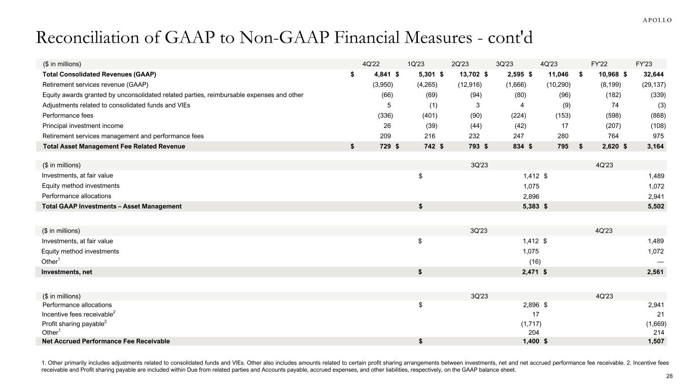 Year ended December 31, ($ in millions) 2014 2015 2016 2017 2018 2019 2020 2021 2022 GAAP Net income (loss) attributable to Apollo Global Management, Inc. Common Stockholders $168 $134 $403 $616 $(42) $807 $120 $1,802 $(1,961) Preferred dividends — — — 14 32 37 37 37 — Net income (loss) attributable to non-controlling interests 562 216 567 814 29 693 310 2,428 (1,546) GAAP Net income (loss) $730 $350 $970 $1,444 $19 $1,537 $467 $4,267 $(3,507) Income tax provision (benefit) 147 27 91 326 86 (129) 86 594 (739) GAAP Income (loss) before Income tax provision (benefit) $877 $377 $1,061 $1,770 $105 $1,408 $553 $4,861 $(4,246) Asset Management Adjustments: Equity-based profit sharing expense and other1 — 1 3 7 91 96 129 146 276 Equity-based compensation 105 62 63 65 68 71 68 80 185 Preferred dividends — — — (14) (32) (37) (37) (37) — Transaction-related charges2 34 39 55 17 (6) 49 39 35 (42) Merger-related transaction and integration costs3 — — — — — — — 67 70 Charges associated with corporate conversion — — — — — 22 4 — — (Gains) losses from changes in tax receivable agreement liability (32) — (3) (200) (35) 50 (12) (10) 26 Net (income) loss attributable to non-controlling interests in consolidated entities (157) (21) (6) (9) (32) (31) (118) (418) 1,499 Unrealized performance fees 1,348 358 (511) (689) 783 (435) (35) (1,465) (2) Unrealized profit sharing expense (517) (137) 180 226 (275) 208 33 649 20 One-time equity-based compensation charges4 — — — — — — — 949 — HoldCo interest and other financing costs 19 27 39 59 69 98 154 170 122 Unrealized principal investment (income) loss 22 13 (65) (95) 62 (88) (62) (222) 176 Unrealized net (gains) losses from investment activities and other (260) (79) (139) (95) 193 (135) 421 (2,431) (144) Retirement Services Adjustments: Investment (gains) losses, net of offsets — — — — — — — — 7,467 Non-operating change in insurance liabilities and related derivatives5 — — — — — — — — (1,433) Integration, restructuring and other non-operating expenses — — — — — — — — 133 Equity-based compensation expense — — — — — — — — 56 Segment Income $1,439 $640 $677 $1,042 $991 $1,276 $1,137 $2,374 $4,163 HoldCo interest and other financing costs (19) (27) (39) (59) (69) (98) (154) (170) (122) Taxes and related payables (74) (10) (10) (26) (44) (62) (90) (172) (795) Adjusted Net Income $1,346 $603 $628 $957 $878 $1,116 $893 $2,032 $3,246 Notable items — — — — — — — — 3 Tax impact of notable items — — — — — — — — (1) Adjusted Net Income, Excluding Notable Items $— $— $— $— $— $— $— $— $3,248 Reconciliation of GAAP to Non-GAAP Financial Measures - cont'd 27 1. Equity-based profit sharing expense and other includes certain profit sharing arrangements in which a portion of performance fees distributed to the general partner are required to be used by employees of Apollo to purchase restricted shares of common stock or is delivered in the form of RSUs, which are granted under the Equity Plan. Equity-based profit sharing expense and other also includes performance grants which are tied to the Company’s receipt of performance fees, within prescribed periods, sufficient to cover the associated equity-based compensation expense. 2. Transaction-related charges include contingent consideration, equity-based compensation charges and the amortization of intangible assets and certain other charges associated with acquisitions, and restructuring charges. 3. Merger-related transaction and integration costs includes advisory services, technology integration, equity-based compensation charges and other costs associated with the Company’s merger with Athene. 4. Includes one-time equity-based compensation expense and associated taxes related to the Company’s compensation structure reset. 5. Includes change in fair values of derivatives and embedded derivatives, non-operating change in funding agreements, change in fair value of market risk benefits, and non-operating change in liability for future policy benefits.