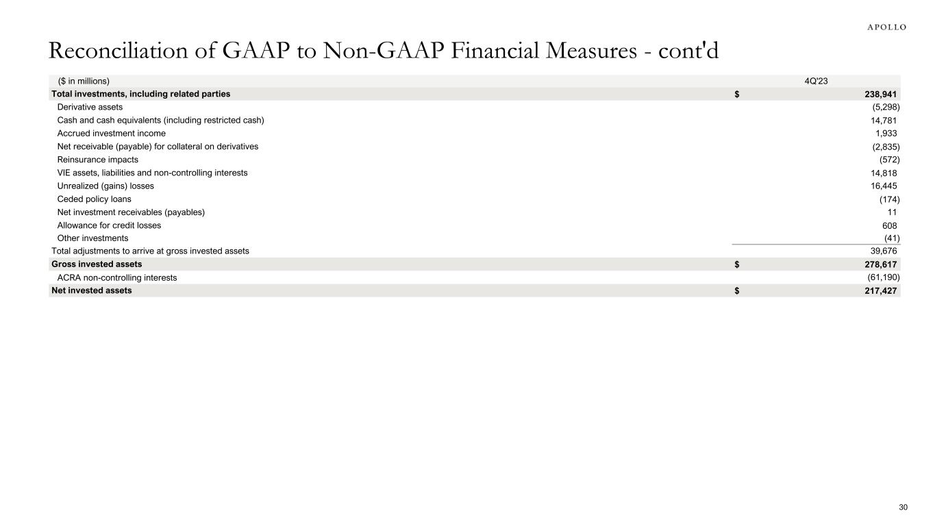 ($ in millions) 4Q'22 1Q'23 2Q'23 3Q'23 4Q'23 FY'22 FY'23 Total Consolidated Revenues (GAAP) $ 4,841 $ 5,301 $ 13,702 $ 2,595 $ 11,046 $ 10,968 $ 32,644 Retirement services revenue (GAAP) (3,950) (4,265) (12,916) (1,666) (10,290) (8,199) (29,137) Equity awards granted by unconsolidated related parties, reimbursable expenses and other (66) (69) (94) (80) (96) (182) (339) Adjustments related to consolidated funds and VIEs 5 (1) 3 4 (9) 74 (3) Performance fees (336) (401) (90) (224) (153) (598) (868) Principal investment income 26 (39) (44) (42) 17 (207) (108) Retirement services management and performance fees 209 216 232 247 280 764 975 Total Asset Management Fee Related Revenue $ 729 $ 742 $ 793 $ 834 $ 795 $ 2,620 $ 3,164 Reconciliation of GAAP to Non-GAAP Financial Measures - cont'd 28 ($ in millions) 3Q'23 4Q'23 Investments, at fair value $ 1,412 $ 1,489 Equity method investments 1,075 1,072 Other1 (16) — Investments, net $ 2,471 $ 2,561 ($ in millions) 3Q'23 4Q'23 Performance allocations $ 2,896 $ 2,941 Incentive fees receivable2 17 21 Profit sharing payable2 (1,717) (1,669) Other1 204 214 Net Accrued Performance Fee Receivable $ 1,400 $ 1,507 ($ in millions) 3Q'23 4Q'23 Investments, at fair value $ 1,412 $ 1,489 Equity method investments 1,075 1,072 Performance allocations 2,896 2,941 Total GAAP Investments – Asset Management $ 5,383 $ 5,502 1. Other primarily includes adjustments related to consolidated funds and VIEs. Other also includes amounts related to certain profit sharing arrangements between investments, net and net accrued performance fee receivable. 2. Incentive fees receivable and Profit sharing payable are included within Due from related parties and Accounts payable, accrued expenses, and other liabilities, respectively, on the GAAP balance sheet.