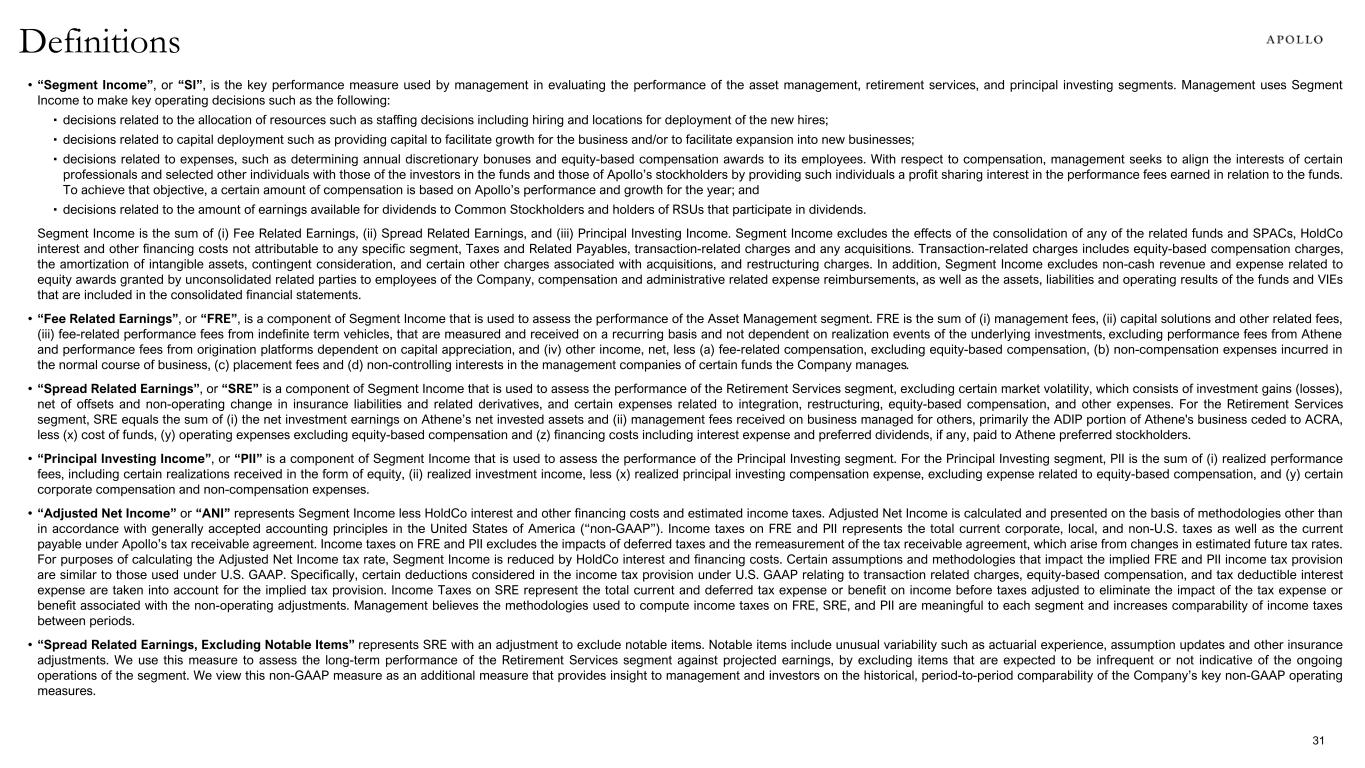 • “Segment Income”, or “SI”, is the key performance measure used by management in evaluating the performance of the asset management, retirement services, and principal investing segments. Management uses Segment Income to make key operating decisions such as the following: ▪ decisions related to the allocation of resources such as staffing decisions including hiring and locations for deployment of the new hires; ▪ decisions related to capital deployment such as providing capital to facilitate growth for the business and/or to facilitate expansion into new businesses; ▪ decisions related to expenses, such as determining annual discretionary bonuses and equity-based compensation awards to its employees. With respect to compensation, management seeks to align the interests of certain professionals and selected other individuals with those of the investors in the funds and those of Apollo’s stockholders by providing such individuals a profit sharing interest in the performance fees earned in relation to the funds. To achieve that objective, a certain amount of compensation is based on Apollo’s performance and growth for the year; and ▪ decisions related to the amount of earnings available for dividends to Common Stockholders and holders of RSUs that participate in dividends. Segment Income is the sum of (i) Fee Related Earnings, (ii) Spread Related Earnings, and (iii) Principal Investing Income. Segment Income excludes the effects of the consolidation of any of the related funds and SPACs, HoldCo interest and other financing costs not attributable to any specific segment, Taxes and Related Payables, transaction-related charges and any acquisitions. Transaction-related charges includes equity-based compensation charges, the amortization of intangible assets, contingent consideration, and certain other charges associated with acquisitions, and restructuring charges. In addition, Segment Income excludes non-cash revenue and expense related to equity awards granted by unconsolidated related parties to employees of the Company, compensation and administrative related expense reimbursements, as well as the assets, liabilities and operating results of the funds and VIEs that are included in the consolidated financial statements. • “Fee Related Earnings”, or “FRE”, is a component of Segment Income that is used to assess the performance of the Asset Management segment. FRE is the sum of (i) management fees, (ii) capital solutions and other related fees, (iii) fee-related performance fees from indefinite term vehicles, that are measured and received on a recurring basis and not dependent on realization events of the underlying investments, excluding performance fees from Athene and performance fees from origination platforms dependent on capital appreciation, and (iv) other income, net, less (a) fee-related compensation, excluding equity-based compensation, (b) non-compensation expenses incurred in the normal course of business, (c) placement fees and (d) non-controlling interests in the management companies of certain funds the Company manages. • “Spread Related Earnings”, or “SRE” is a component of Segment Income that is used to assess the performance of the Retirement Services segment, excluding certain market volatility, which consists of investment gains (losses), net of offsets and non-operating change in insurance liabilities and related derivatives, and certain expenses related to integration, restructuring, equity-based compensation, and other expenses. For the Retirement Services segment, SRE equals the sum of (i) the net investment earnings on Athene’s net invested assets and (ii) management fees received on business managed for others, primarily the ADIP portion of Athene's business ceded to ACRA, less (x) cost of funds, (y) operating expenses excluding equity-based compensation and (z) financing costs including interest expense and preferred dividends, if any, paid to Athene preferred stockholders. • “Principal Investing Income”, or “PII” is a component of Segment Income that is used to assess the performance of the Principal Investing segment. For the Principal Investing segment, PII is the sum of (i) realized performance fees, including certain realizations received in the form of equity, (ii) realized investment income, less (x) realized principal investing compensation expense, excluding expense related to equity-based compensation, and (y) certain corporate compensation and non-compensation expenses. • “Adjusted Net Income” or “ANI” represents Segment Income less HoldCo interest and other financing costs and estimated income taxes. Adjusted Net Income is calculated and presented on the basis of methodologies other than in accordance with generally accepted accounting principles in the United States of America (“non-GAAP”). Income taxes on FRE and PII represents the total current corporate, local, and non-U.S. taxes as well as the current payable under Apollo’s tax receivable agreement. Income taxes on FRE and PII excludes the impacts of deferred taxes and the remeasurement of the tax receivable agreement, which arise from changes in estimated future tax rates. For purposes of calculating the Adjusted Net Income tax rate, Segment Income is reduced by HoldCo interest and financing costs. Certain assumptions and methodologies that impact the implied FRE and PII income tax provision are similar to those used under U.S. GAAP. Specifically, certain deductions considered in the income tax provision under U.S. GAAP relating to transaction related charges, equity-based compensation, and tax deductible interest expense are taken into account for the implied tax provision. Income Taxes on SRE represent the total current and deferred tax expense or benefit on income before taxes adjusted to eliminate the impact of the tax expense or benefit associated with the non-operating adjustments. Management believes the methodologies u