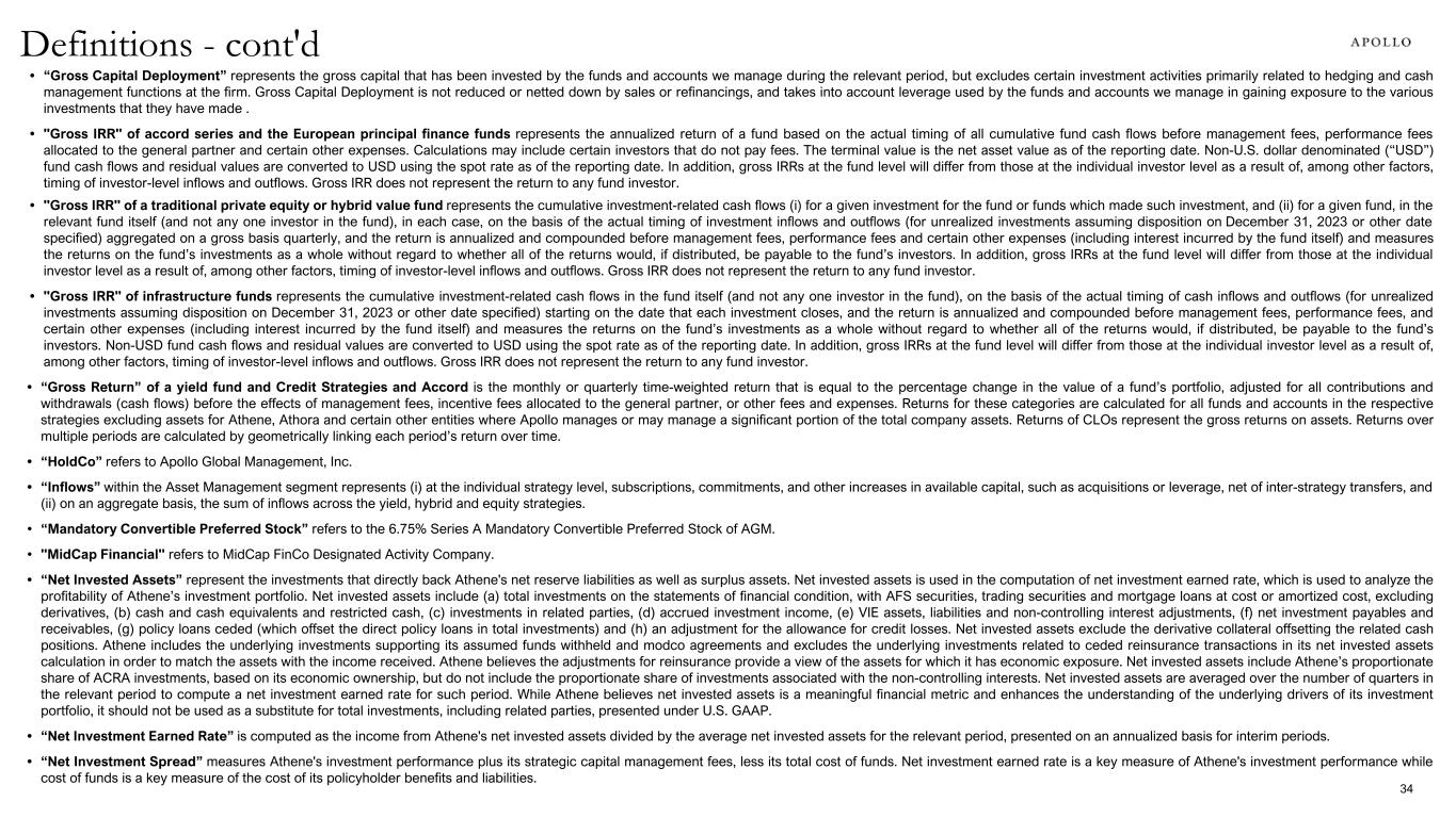 • “Gross Capital Deployment” represents the gross capital that has been invested by the funds and accounts we manage during the relevant period, but excludes certain investment activities primarily related to hedging and cash management functions at the firm. Gross Capital Deployment is not reduced or netted down by sales or refinancings, and takes into account leverage used by the funds and accounts we manage in gaining exposure to the various investments that they have made . • "Gross IRR" of accord series and the European principal finance funds represents the annualized return of a fund based on the actual timing of all cumulative fund cash flows before management fees, performance fees allocated to the general partner and certain other expenses. Calculations may include certain investors that do not pay fees. The terminal value is the net asset value as of the reporting date. Non-U.S. dollar denominated (“USD”) fund cash flows and residual values are converted to USD using the spot rate as of the reporting date. In addition, gross IRRs at the fund level will differ from those at the individual investor level as a result of, among other factors, timing of investor-level inflows and outflows. Gross IRR does not represent the return to any fund investor. • "Gross IRR" of a traditional private equity or hybrid value fund represents the cumulative investment-related cash flows (i) for a given investment for the fund or funds which made such investment, and (ii) for a given fund, in the relevant fund itself (and not any one investor in the fund), in each case, on the basis of the actual timing of investment inflows and outflows (for unrealized investments assuming disposition on December 31, 2023 or other date specified) aggregated on a gross basis quarterly, and the return is annualized and compounded before management fees, performance fees and certain other expenses (including interest incurred by the fund itself) and measures the returns on the fund’s investments as a whole without regard to whether all of the returns would, if distributed, be payable to the fund’s investors. In addition, gross IRRs at the fund level will differ from those at the individual investor level as a result of, among other factors, timing of investor-level inflows and outflows. Gross IRR does not represent the return to any fund investor. • "Gross IRR" of infrastructure funds represents the cumulative investment-related cash flows in the fund itself (and not any one investor in the fund), on the basis of the actual timing of cash inflows and outflows (for unrealized investments assuming disposition on December 31, 2023 or other date specified) starting on the date that each investment closes, and the return is annualized and compounded before management fees, performance fees, and certain other expenses (including interest incurred by the fund itself) and measures the returns on the fund’s investments as a whole without regard to whether all of the returns would, if distributed, be payable to the fund’s investors. Non-USD fund cash flows and residual values are converted to USD using the spot rate as of the reporting date. In addition, gross IRRs at the fund level will differ from those at the individual investor level as a result of, among other factors, timing of investor-level inflows and outflows. Gross IRR does not represent the return to any fund investor. • “Gross Return” of a yield fund and Credit Strategies and Accord is the monthly or quarterly time-weighted return that is equal to the percentage change in the value of a fund’s portfolio, adjusted for all contributions and withdrawals (cash flows) before the effects of management fees, incentive fees allocated to the general partner, or other fees and expenses. Returns for these categories are calculated for all funds and accounts in the respective strategies excluding assets for Athene, Athora and certain other entities where Apollo manages or may manage a significant portion of the total company assets. Returns of CLOs represent the gross returns on assets. Returns over multiple periods are calculated by geometrically linking each period’s return over time. • “HoldCo” refers to Apollo Global Management, Inc. • “Inflows” within the Asset Management segment represents (i) at the individual strategy level, subscriptions, commitments, and other increases in available capital, such as acquisitions or leverage, net of inter-strategy transfers, and (ii) on an aggregate basis, the sum of inflows across the yield, hybrid and equity strategies. • “Mandatory Convertible Preferred Stock” refers to the 6.75% Series A Mandatory Convertible Preferred Stock of AGM. • "MidCap Financial" refers to MidCap FinCo Designated Activity Company. • “Net Invested Assets” represent the investments that directly back Athene's net reserve liabilities as well as surplus assets. Net invested assets is used in the computation of net investment earned rate, which is used to analyze the profitability of Athene’s investment portfolio. Net invested assets include (a) total investments on the statements of financial condition, with AFS securities, trading securities and mortgage loans at cost or amortized cost, excluding derivatives, (b) cash and cash equivalents and restricted cash, (c) investments in related parties, (d) accrued investment income, (e) VIE assets, liabilities and non-controlling interest adjustments, (f) net investment payables and receivables, (g) policy loans ceded (which offset the direct policy loans in total investments) and (h) an adjustment for the allowance for credit losses. Net invested assets exclude the derivative collateral offsetting the related cash positions. Athene includes the underlying investments supporting its assumed funds withheld and modco agreements and excludes the underlying investments related to ceded reinsurance transactions in its net invested assets calculation in order 