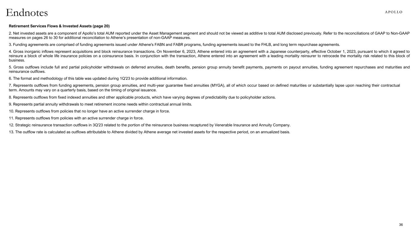 Retirement Services Flows & Invested Assets (page 20) 2. Net invested assets are a component of Apollo’s total AUM reported under the Asset Management segment and should not be viewed as additive to total AUM disclosed previously. Refer to the reconciliations of GAAP to Non-GAAP measures on pages 26 to 30 for additional reconciliation to Athene’s presentation of non-GAAP measures. 3. Funding agreements are comprised of funding agreements issued under Athene's FABN and FABR programs, funding agreements issued to the FHLB, and long term repurchase agreements. 4. Gross inorganic inflows represent acquisitions and block reinsurance transactions. On November 6, 2023, Athene entered into an agreement with a Japanese counterparty, effective October 1, 2023, pursuant to which it agreed to reinsure a block of whole life insurance policies on a coinsurance basis. In conjunction with the transaction, Athene entered into an agreement with a leading mortality reinsurer to retrocede the mortality risk related to this block of business. 5. Gross outflows include full and partial policyholder withdrawals on deferred annuities, death benefits, pension group annuity benefit payments, payments on payout annuities, funding agreement repurchases and maturities and reinsurance outflows. 6. The format and methodology of this table was updated during 1Q'23 to provide additional information. 7. Represents outflows from funding agreements, pension group annuities, and multi-year guarantee fixed annuities (MYGA), all of which occur based on defined maturities or substantially lapse upon reaching their contractual term. Amounts may vary on a quarterly basis, based on the timing of original issuance. 8. Represents outflows from fixed indexed annuities and other applicable products, which have varying degrees of predictability due to policyholder actions. 9. Represents partial annuity withdrawals to meet retirement income needs within contractual annual limits. 10. Represents outflows from policies that no longer have an active surrender charge in force. 11. Represents outflows from policies with an active surrender charge in force. 12. Strategic reinsurance transaction outflows in 3Q'23 related to the portion of the reinsurance business recaptured by Venerable Insurance and Annuity Company. 13. The outflow rate is calculated as outflows attributable to Athene divided by Athene average net invested assets for the respective period, on an annualized basis. Endnotes 36