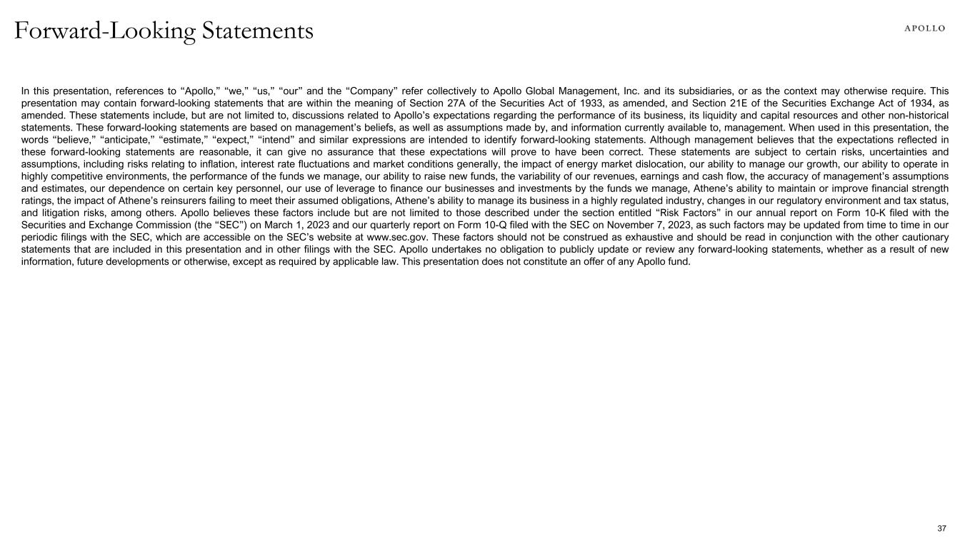 Forward-Looking Statements In this presentation, references to “Apollo,” “we,” “us,” “our” and the “Company” refer collectively to Apollo Global Management, Inc. and its subsidiaries, or as the context may otherwise require. This presentation may contain forward-looking statements that are within the meaning of Section 27A of the Securities Act of 1933, as amended, and Section 21E of the Securities Exchange Act of 1934, as amended. These statements include, but are not limited to, discussions related to Apollo’s expectations regarding the performance of its business, its liquidity and capital resources and other non-historical statements. These forward-looking statements are based on management’s beliefs, as well as assumptions made by, and information currently available to, management. When used in this presentation, the words “believe,” “anticipate,” “estimate,” “expect,” “intend” and similar expressions are intended to identify forward-looking statements. Although management believes that the expectations reflected in these forward-looking statements are reasonable, it can give no assurance that these expectations will prove to have been correct. These statements are subject to certain risks, uncertainties and assumptions, including risks relating to inflation, interest rate fluctuations and market conditions generally, the impact of energy market dislocation, our ability to manage our growth, our ability to operate in highly competitive environments, the performance of the funds we manage, our ability to raise new funds, the variability of our revenues, earnings and cash flow, the accuracy of management’s assumptions and estimates, our dependence on certain key personnel, our use of leverage to finance our businesses and investments by the funds we manage, Athene’s ability to maintain or improve financial strength ratings, the impact of Athene’s reinsurers failing to meet their assumed obligations, Athene’s ability to manage its business in a highly regulated industry, changes in our regulatory environment and tax status, and litigation risks, among others. Apollo believes these factors include but are not limited to those described under the section entitled “Risk Factors” in our annual report on Form 10-K filed with the Securities and Exchange Commission (the “SEC”) on March 1, 2023 and our quarterly report on Form 10-Q filed with the SEC on November 7, 2023, as such factors may be updated from time to time in our periodic filings with the SEC, which are accessible on the SEC’s website at www.sec.gov. These factors should not be construed as exhaustive and should be read in conjunction with the other cautionary statements that are included in this presentation and in other filings with the SEC. Apollo undertakes no obligation to publicly update or review any forward-looking statements, whether as a result of new information, future developments or otherwise, except as required by applicable law. This presentation does not constitute an offer of any Apollo fund. 37