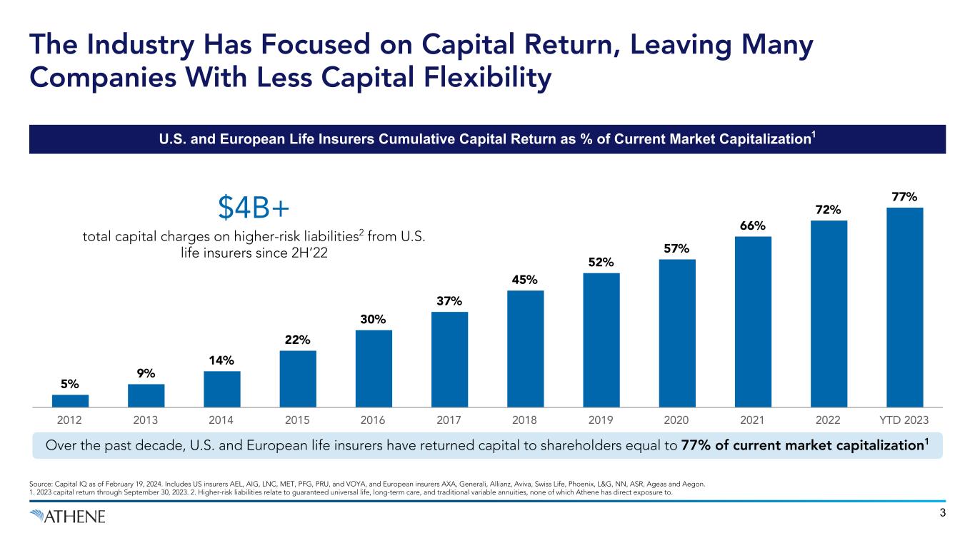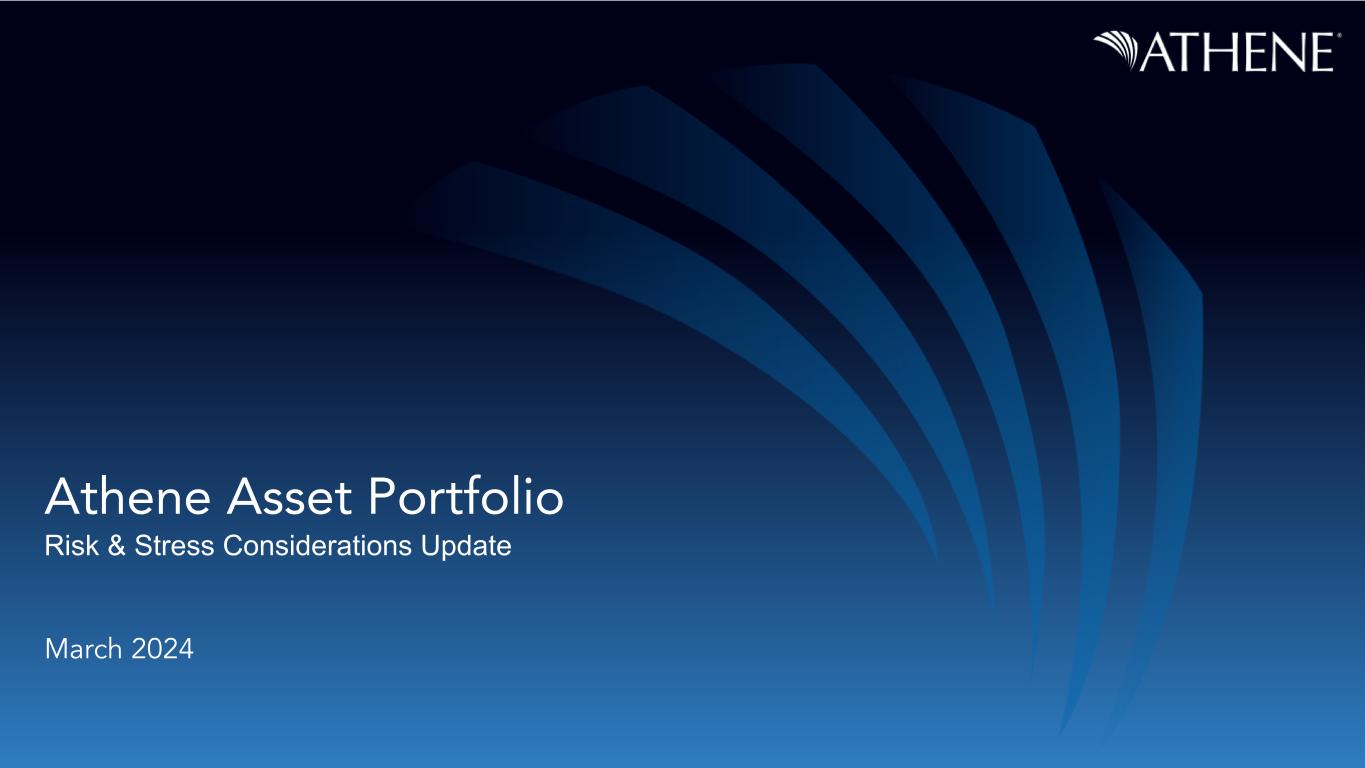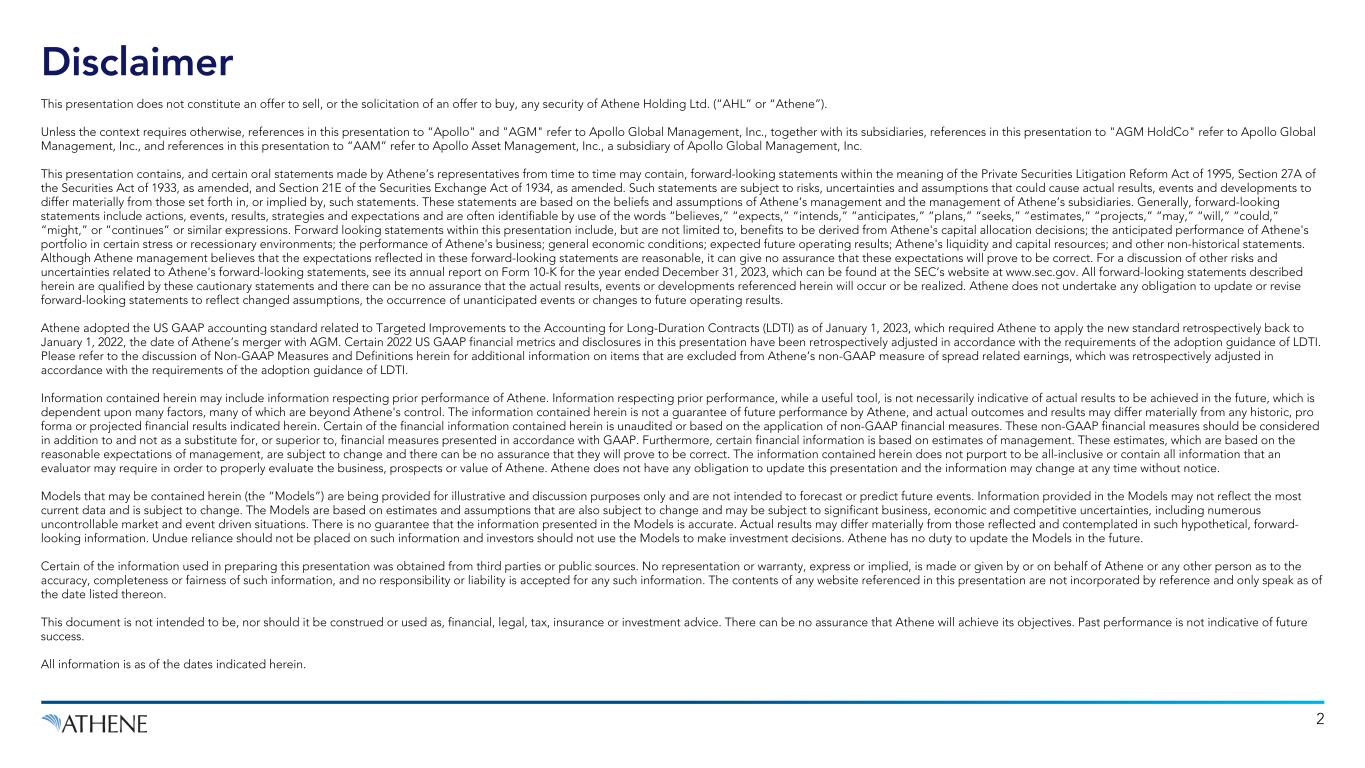 Disclaimer This presentation does not constitute an offer to sell, or the solicitation of an offer to buy, any security of Athene Holding Ltd. (“AHL” or “Athene”). Unless the context requires otherwise, references in this presentation to “Apollo" and "AGM" refer to Apollo Global Management, Inc., together with its subsidiaries, references in this presentation to "AGM HoldCo" refer to Apollo Global Management, Inc., and references in this presentation to “AAM” refer to Apollo Asset Management, Inc., a subsidiary of Apollo Global Management, Inc. This presentation contains, and certain oral statements made by Athene’s representatives from time to time may contain, forward-looking statements within the meaning of the Private Securities Litigation Reform Act of 1995, Section 27A of the Securities Act of 1933, as amended, and Section 21E of the Securities Exchange Act of 1934, as amended. Such statements are subject to risks, uncertainties and assumptions that could cause actual results, events and developments to differ materially from those set forth in, or implied by, such statements. These statements are based on the beliefs and assumptions of Athene’s management and the management of Athene’s subsidiaries. Generally, forward-looking statements include actions, events, results, strategies and expectations and are often identifiable by use of the words “believes,” “expects,” “intends,” “anticipates,” “plans,” “seeks,” “estimates,” “projects,” “may,” “will,” “could,” “might,” or “continues” or similar expressions. Forward looking statements within this presentation include, but are not limited to, benefits to be derived from Athene's capital allocation decisions; the anticipated performance of Athene's portfolio in certain stress or recessionary environments; the performance of Athene's business; general economic conditions; expected future operating results; Athene's liquidity and capital resources; and other non-historical statements. Although Athene management believes that the expectations reflected in these forward-looking statements are reasonable, it can give no assurance that these expectations will prove to be correct. For a discussion of other risks and uncertainties related to Athene's forward-looking statements, see its annual report on Form 10-K for the year ended December 31, 2023, which can be found at the SEC’s website at www.sec.gov. All forward-looking statements described herein are qualified by these cautionary statements and there can be no assurance that the actual results, events or developments referenced herein will occur or be realized. Athene does not undertake any obligation to update or revise forward-looking statements to reflect changed assumptions, the occurrence of unanticipated events or changes to future operating results. Athene adopted the US GAAP accounting standard related to Targeted Improvements to the Accounting for Long-Duration Contracts (LDTI) as of January 1, 2023, which required Athene to apply the new standard retrospectively back to January 1, 2022, the date of Athene’s merger with AGM. Certain 2022 US GAAP financial metrics and disclosures in this presentation have been retrospectively adjusted in accordance with the requirements of the adoption guidance of LDTI. Please refer to the discussion of Non-GAAP Measures and Definitions herein for additional information on items that are excluded from Athene’s non-GAAP measure of spread related earnings, which was retrospectively adjusted in accordance with the requirements of the adoption guidance of LDTI. Information contained herein may include information respecting prior performance of Athene. Information respecting prior performance, while a useful tool, is not necessarily indicative of actual results to be achieved in the future, which is dependent upon many factors, many of which are beyond Athene's control. The information contained herein is not a guarantee of future performance by Athene, and actual outcomes and results may differ materially from any historic, pro forma or projected financial results indicated herein. Certain of the financial information contained herein is unaudited or based on the application of non-GAAP financial measures. These non-GAAP financial measures should be considered in addition to and not as a substitute for, or superior to, financial measures presented in accordance with GAAP. Furthermore, certain financial information is based on estimates of management. These estimates, which are based on the reasonable expectations of management, are subject to change and there can be no assurance that they will prove to be correct. The information contained herein does not purport to be all-inclusive or contain all information that an evaluator may require in order to properly evaluate the business, prospects or value of Athene. Athene does not have any obligation to update this presentation and the information may change at any time without notice. Models that may be contained herein (the “Models”) are being provided for illustrative and discussion purposes only and are not intended to forecast or predict future events. Information provided in the Models may not reflect the most current data and is subject to change. The Models are based on estimates and assumptions that are also subject to change and may be subject to significant business, economic and competitive uncertainties, including numerous uncontrollable market and event driven situations. There is no guarantee that the information presented in the Models is accurate. Actual results may differ materially from those reflected and contemplated in such hypothetical, forward- looking information. Undue reliance should not be placed on such information and investors should not use the Models to make investment decisions. Athene has no duty to update the Models in the future. Certain of the information used in preparing this presentat