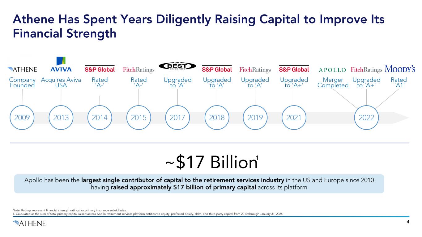 5% 9% 14% 22% 30% 37% 45% 52% 57% 66% 72% 77% 2012 2013 2014 2015 2016 2017 2018 2019 2020 2021 2022 YTD 2023 3 The Industry Has Focused on Capital Return, Leaving Many Companies With Less Capital Flexibility U.S. and European Life Insurers Cumulative Capital Return as % of Current Market Capitalization1 Over the past decade, U.S. and European life insurers have returned capital to shareholders equal to 77% of current market capitalization1 $4B+ total capital charges on higher-risk liabilities2 from U.S. life insurers since 2H’22 Source: Capital IQ as of February 19, 2024. Includes US insurers AEL, AIG, LNC, MET, PFG, PRU, and VOYA, and European insurers AXA, Generali, Allianz, Aviva, Swiss Life, Phoenix, L&G, NN, ASR, Ageas and Aegon. 1. 2023 capital return through September 30, 2023. 2. Higher-risk liabilities relate to guaranteed universal life, long-term care, and traditional variable annuities, none of which Athene has direct exposure to.