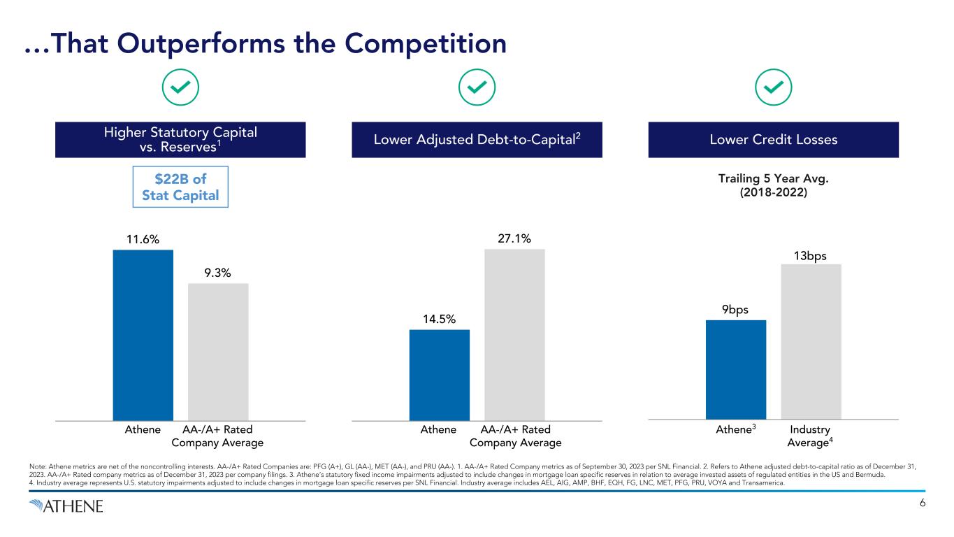 5 Note: Athene metrics are net of the noncontrolling interests, as of December 31, 2023. 1. Relates to Athene’s primary insurance subsidiaries; represents ratings from AM Best "A", Fitch "A+", S&P "A+" and Moody’s "A1". 2. Represents the aggregate capital of Athene's US and Bermuda insurance entities, determined with respect to each insurance entity by applying the statutory accounting principles applicable to each such entity. Adjustments are made to, among other things, assets and expenses at the holding company level. Excludes capital from noncontrolling interests. 3. Computed as capital in excess of the capital required to support our core operating strategies, as determined based upon internal modeling and analysis of economic risk, as well as inputs from rating agency capital models and consideration of both NAIC RBC and Bermuda capital requirements. 4. Includes $10.5 billion of cash and cash equivalents, $2.6 billion AHL/Athene Life Re Ltd. (ALRe) liquidity facility with $0.5 billion accordion feature, $2.0 billion committed repos, $1.25 billion AHL credit facility with $0.5 billion accordion feature, $3.7 billion of FHLB capacity, and $60.5 billion liquid bond portfolio. Availability of accordion features subject to lender consent and other factors. 5. Includes $2.6 billion in excess equity capital, $3.8 billion in untapped debt capacity and $1.6 billion in available undrawn capital at ACRA. Untapped debt capacity assumes capacity of 25% debt-to-capitalization and is subject to general availability and market conditions. Athene Has Built a Fortress Balance Sheet… Financial Strength Profile A+ $2.6B Excess Equity Capital3 $22B Regulatory Capital2 $8.0B Total Deployable Capital5 Available Liquidity $82B 41