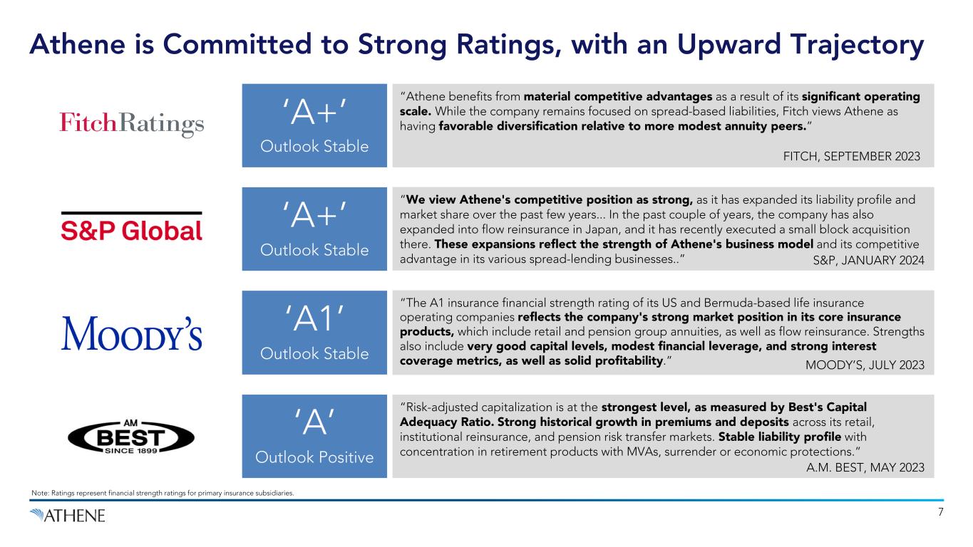 11.6% 9.3% 6 Note: Athene metrics are net of the noncontrolling interests. AA-/A+ Rated Companies are: PFG (A+), GL (AA-), MET (AA-), and PRU (AA-). 1. AA-/A+ Rated Company metrics as of September 30, 2023 per SNL Financial. 2. Refers to Athene adjusted debt-to-capital ratio as of December 31, 2023. AA-/A+ Rated company metrics as of December 31, 2023 per company filings. 3. Athene’s statutory fixed income impairments adjusted to include changes in mortgage loan specific reserves in relation to average invested assets of regulated entities in the US and Bermuda. 4. Industry average represents U.S. statutory impairments adjusted to include changes in mortgage loan specific reserves per SNL Financial. Industry average includes AEL, AIG, AMP, BHF, EQH, FG, LNC, MET, PFG, PRU, VOYA and Transamerica. $22B of Stat Capital Trailing 5 Year Avg. (2018-2022) Higher Statutory Capital vs. Reserves1 Lower Adjusted Debt-to-Capital2 Lower Credit Losses Athene AA-/A+ Rated Company Average 14.5% 27.1% Athene AA-/A+ Rated Company Average Athene3 Industry Average4 9bps 13bps …That Outperforms the Competition
