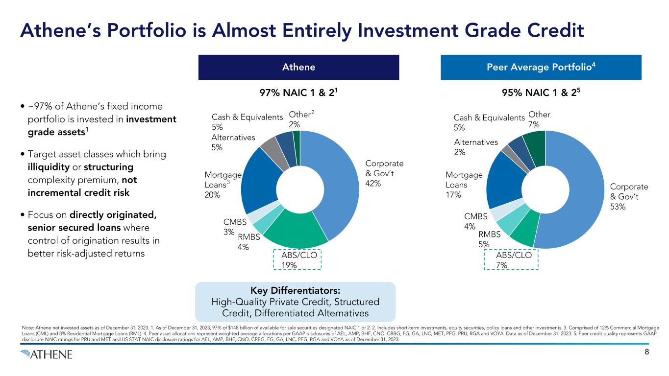 “Risk-adjusted capitalization is at the strongest level, as measured by Best's Capital Adequacy Ratio. Strong historical growth in premiums and deposits across its retail, institutional reinsurance, and pension risk transfer markets. Stable liability profile with concentration in retirement products with MVAs, surrender or economic protections.” “The A1 insurance financial strength rating of its US and Bermuda-based life insurance operating companies reflects the company's strong market position in its core insurance products, which include retail and pension group annuities, as well as flow reinsurance. Strengths also include very good capital levels, modest financial leverage, and strong interest coverage metrics, as well as solid profitability.” ‘A1’ Outlook Stable 7 ‘A+’ Outlook Stable “Athene benefits from material competitive advantages as a result of its significant operating scale. While the company remains focused on spread-based liabilities, Fitch views Athene as having favorable diversification relative to more modest annuity peers.” “We view Athene's competitive position as strong, as it has expanded its liability profile and market share over the past few years... In the past couple of years, the company has also expanded into flow reinsurance in Japan, and it has recently executed a small block acquisition there. These expansions reflect the strength of Athene's business model and its competitive advantage in its various spread-lending businesses..” ‘A+’ Outlook Stable ‘A’ Outlook Positive S&P, JANUARY 2024 FITCH, SEPTEMBER 2023 A.M. BEST, MAY 2023 MOODY’S, JULY 2023 Note: Ratings represent financial strength ratings for primary insurance subsidiaries. Athene is Committed to Strong Ratings, with an Upward Trajectory