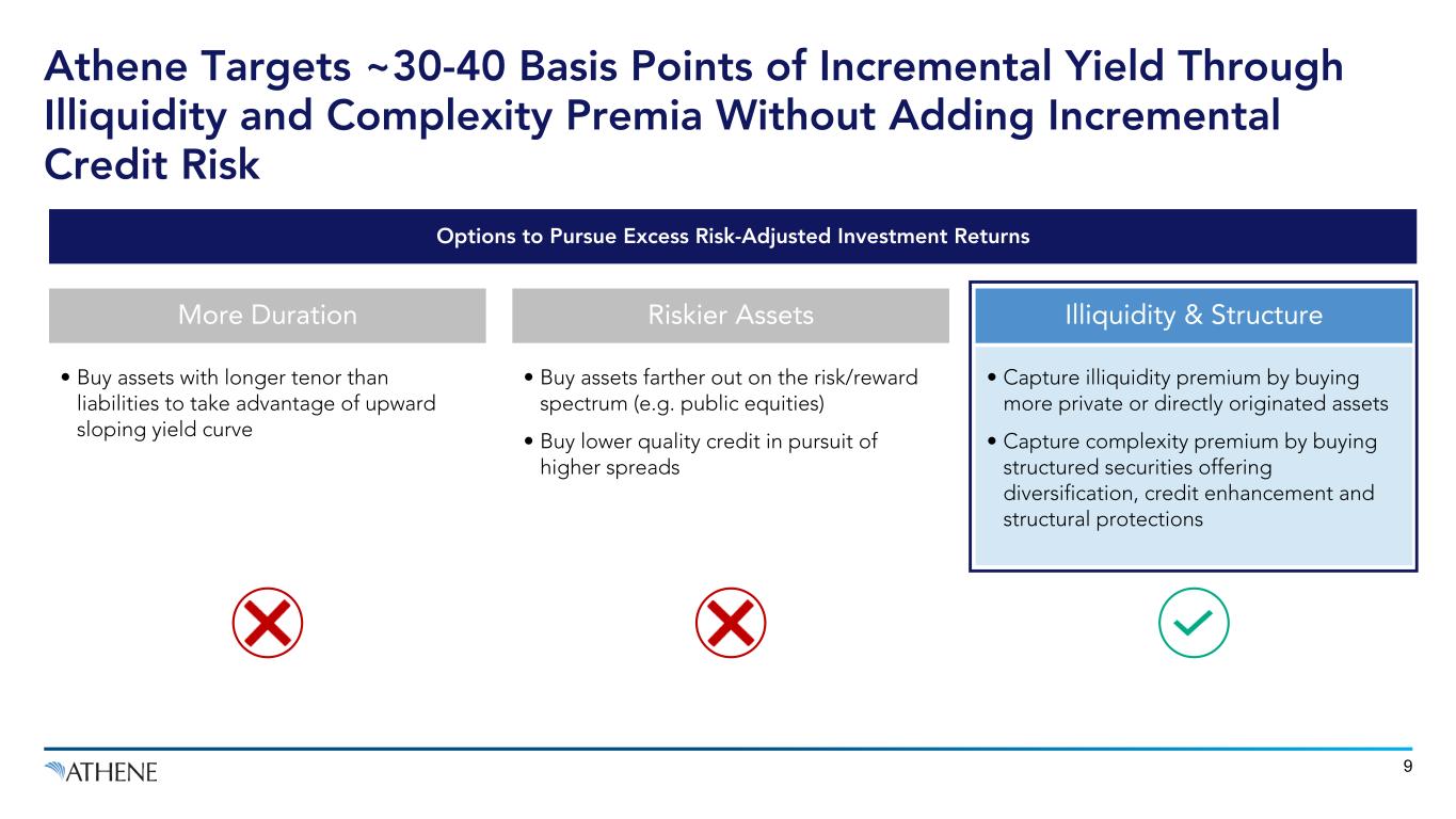 8 95% NAIC 1 & 2597% NAIC 1 & 21 Note: Athene net invested assets as of December 31, 2023. 1. As of December 31, 2023, 97% of $148 billion of available for sale securities designated NAIC 1 or 2. 2. Includes short-term investments, equity securities, policy loans and other investments. 3. Comprised of 12% Commercial Mortgage Loans (CML) and 8% Residential Mortgage Loans (RML). 4. Peer asset allocations represent weighted average allocations per GAAP disclosures of AEL, AMP, BHF, CNO, CRBG, FG, GA, LNC, MET, PFG, PRU, RGA and VOYA. Data as of December 31, 2023. 5. Peer credit quality represents GAAP disclosure NAIC ratings for PRU and MET and US STAT NAIC disclosure ratings for AEL, AMP, BHF, CNO, CRBG, FG, GA, LNC, PFG, RGA and VOYA as of December 31, 2023. Athene Peer Average Portfolio4 Key Differentiators: High-Quality Private Credit, Structured Credit, Differentiated Alternatives Athene’s Portfolio is Almost Entirely Investment Grade Credit Corporate & Gov’t 42% ABS/CLO 19% RMBS 4% CMBS 3% Mortgage Loans 20% Alternatives 5% Cash & Equivalents 5% Other 2% Corporate & Gov’t 53% ABS/CLO 7% RMBS 5% CMBS 4% Mortgage Loans 17% Alternatives 2% Cash & Equivalents 5% Other 7% 2 3 • ~97% of Athene’s fixed income portfolio is invested in investment grade assets1 • Target asset classes which bring illiquidity or structuring complexity premium, not incremental credit risk • Focus on directly originated, senior secured loans where control of origination results in better risk-adjusted returns