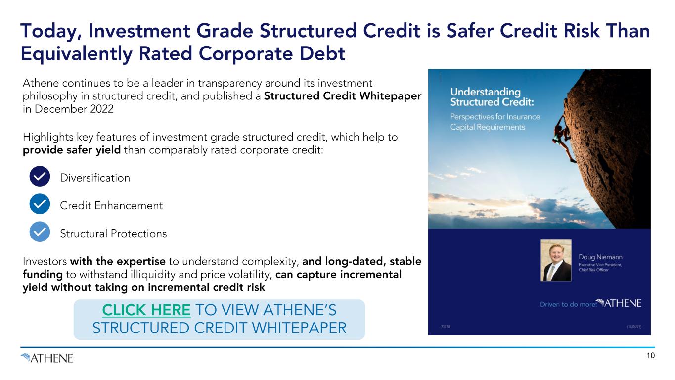 More Duration Riskier Assets Illiquidity & Structure • Buy assets with longer tenor than liabilities to take advantage of upward sloping yield curve • Buy assets farther out on the risk/reward spectrum (e.g. public equities) • Buy lower quality credit in pursuit of higher spreads • Capture illiquidity premium by buying more private or directly originated assets • Capture complexity premium by buying structured securities offering diversification, credit enhancement and structural protections Options to Pursue Excess Risk-Adjusted Investment Returns Athene Targets ~30-40 Basis Points of Incremental Yield Through Illiquidity and Complexity Premia Without Adding Incremental Credit Risk 9