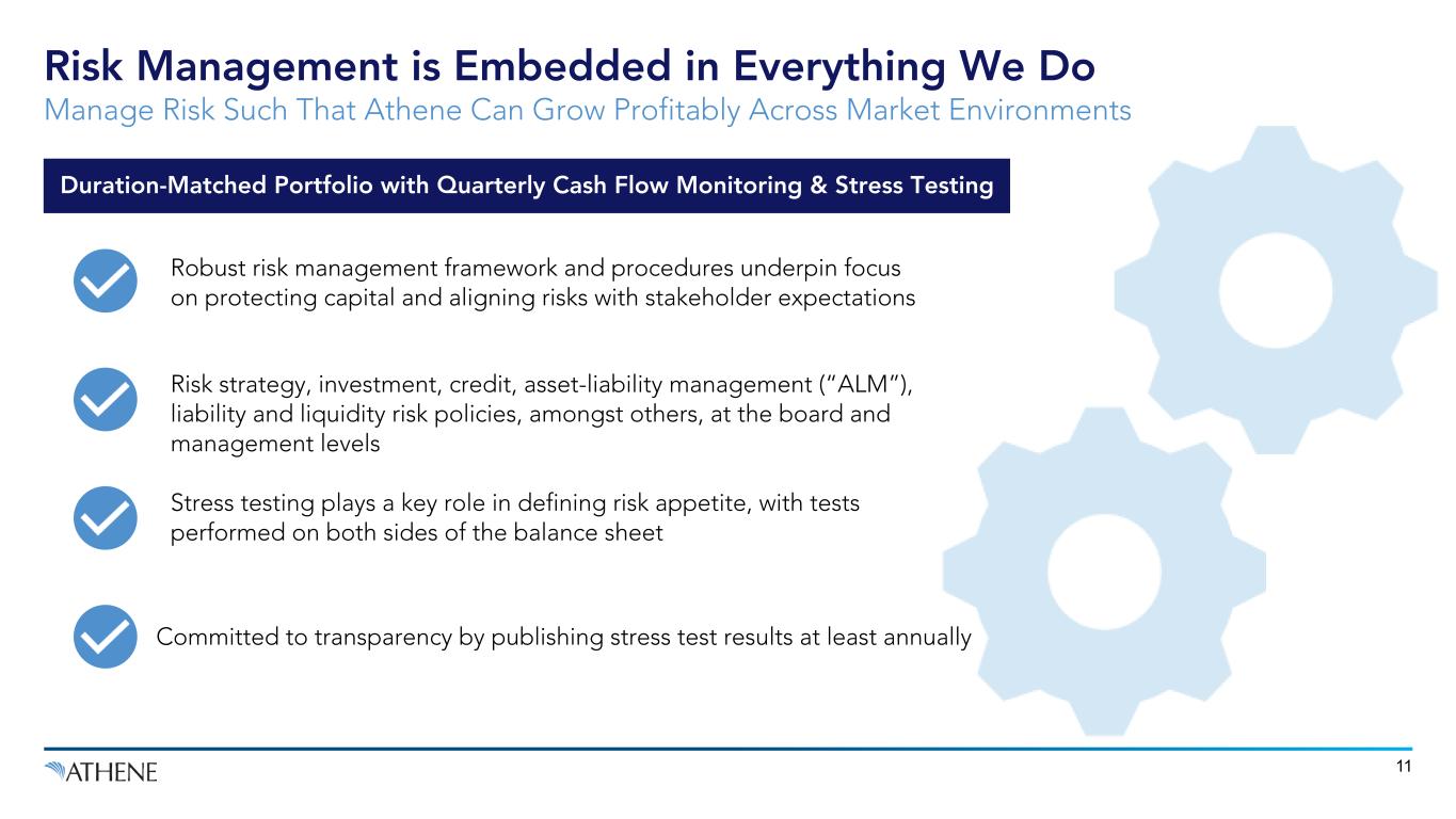 Today, Investment Grade Structured Credit is Safer Credit Risk Than Equivalently Rated Corporate Debt Athene continues to be a leader in transparency around its investment philosophy in structured credit, and published a Structured Credit Whitepaper in December 2022 Highlights key features of investment grade structured credit, which help to provide safer yield than comparably rated corporate credit: Diversification Credit Enhancement Structural Protections Investors with the expertise to understand complexity, and long-dated, stable funding to withstand illiquidity and price volatility, can capture incremental yield without taking on incremental credit risk CLICK HERE TO VIEW ATHENE’S STRUCTURED CREDIT WHITEPAPER 10