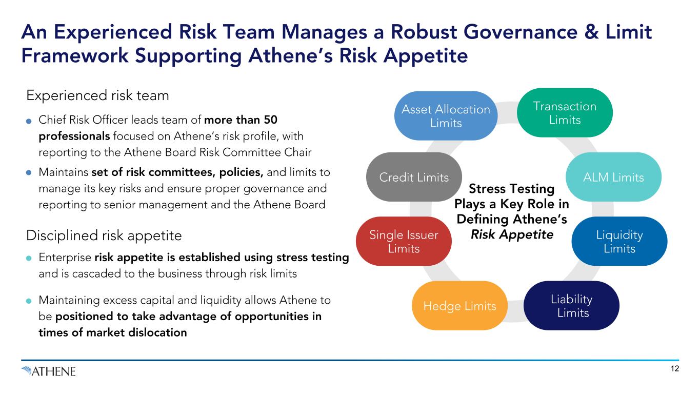 11 Risk Management is Embedded in Everything We Do Manage Risk Such That Athene Can Grow Profitably Across Market Environments Robust risk management framework and procedures underpin focus on protecting capital and aligning risks with stakeholder expectations Risk strategy, investment, credit, asset-liability management (“ALM”), liability and liquidity risk policies, amongst others, at the board and management levels Stress testing plays a key role in defining risk appetite, with tests performed on both sides of the balance sheet Duration-Matched Portfolio with Quarterly Cash Flow Monitoring & Stress Testing Committed to transparency by publishing stress test results at least annually