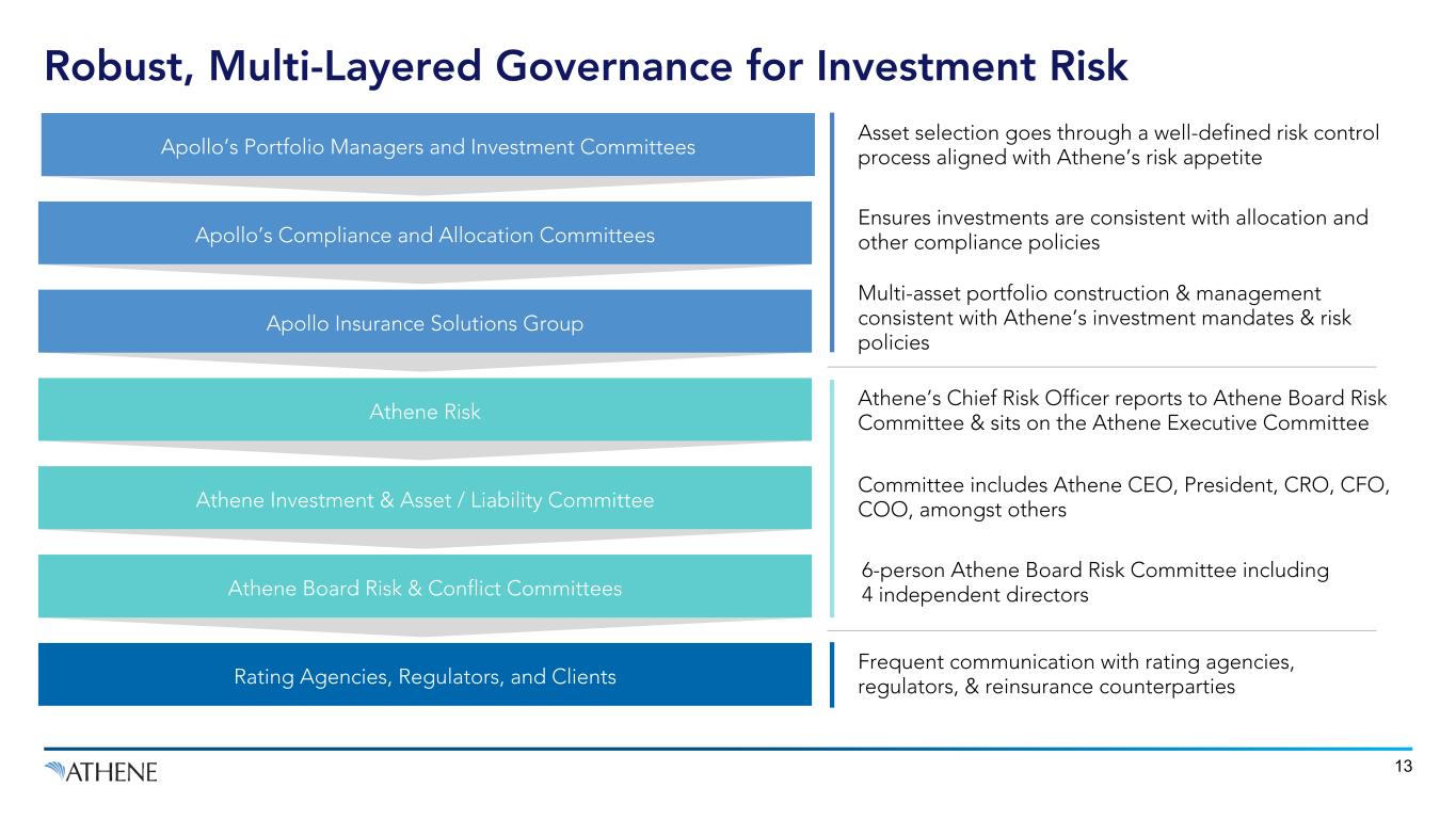 12 Disciplined risk appetite Experienced risk team Enterprise risk appetite is established using stress testing and is cascaded to the business through risk limits Maintaining excess capital and liquidity allows Athene to be positioned to take advantage of opportunities in times of market dislocation Chief Risk Officer leads team of more than 50 professionals focused on Athene’s risk profile, with reporting to the Athene Board Risk Committee Chair Maintains set of risk committees, policies, and limits to manage its key risks and ensure proper governance and reporting to senior management and the Athene Board Stress Testing Plays a Key Role in Defining Athene’s Risk Appetite ALM Limits Liquidity Limits Hedge Limits Single Issuer Limits Credit Limits Transaction Limits Asset Allocation Limits An Experienced Risk Team Manages a Robust Governance & Limit Framework Supporting Athene’s Risk Appetite Liability Limits