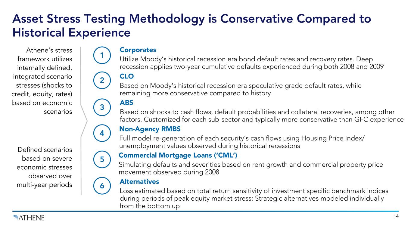 13 Apollo’s Portfolio Managers and Investment Committees Apollo Insurance Solutions Group Apollo’s Compliance and Allocation Committees Athene Risk Athene Investment & Asset / Liability Committee Athene Board Risk & Conflict Committees Rating Agencies, Regulators, and Clients Ensures investments are consistent with allocation and other compliance policies Athene’s Chief Risk Officer reports to Athene Board Risk Committee & sits on the Athene Executive Committee Frequent communication with rating agencies, regulators, & reinsurance counterparties Multi-asset portfolio construction & management consistent with Athene’s investment mandates & risk policies Committee includes Athene CEO, President, CRO, CFO, COO, amongst others 6-person Athene Board Risk Committee including 4 independent directors Robust, Multi-Layered Governance for Investment Risk Asset selection goes through a well-defined risk control process aligned with Athene’s risk appetite