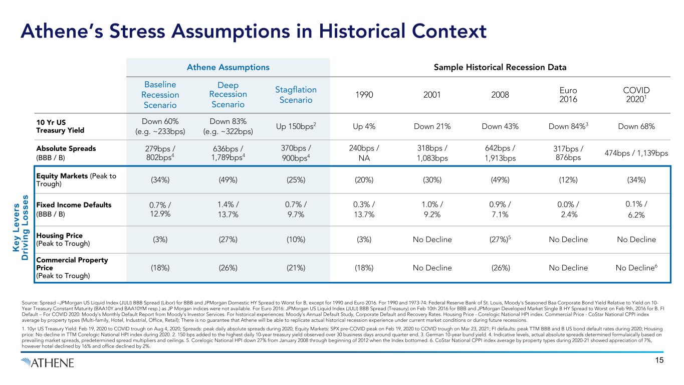 14 Athene’s stress framework utilizes internally defined, integrated scenario stresses (shocks to credit, equity, rates) based on economic scenarios Defined scenarios based on severe economic stresses observed over multi-year periods Corporates Utilize Moody’s historical recession era bond default rates and recovery rates. Deep recession applies two-year cumulative defaults experienced during both 2008 and 2009 1 CLO Based on Moody's historical recession era speculative grade default rates, while remaining more conservative compared to history 2 Non-Agency RMBS Full model re-generation of each security’s cash flows using Housing Price Index/ unemployment values observed during historical recessions 4 Commercial Mortgage Loans (‘CML’) Simulating defaults and severities based on rent growth and commercial property price movement observed during 2008 5 Alternatives Loss estimated based on total return sensitivity of investment specific benchmark indices during periods of peak equity market stress; Strategic alternatives modeled individually from the bottom up 6 3 ABS Based on shocks to cash flows, default probabilities and collateral recoveries, among other factors. Customized for each sub-sector and typically more conservative than GFC experience Asset Stress Testing Methodology is Conservative Compared to Historical Experience