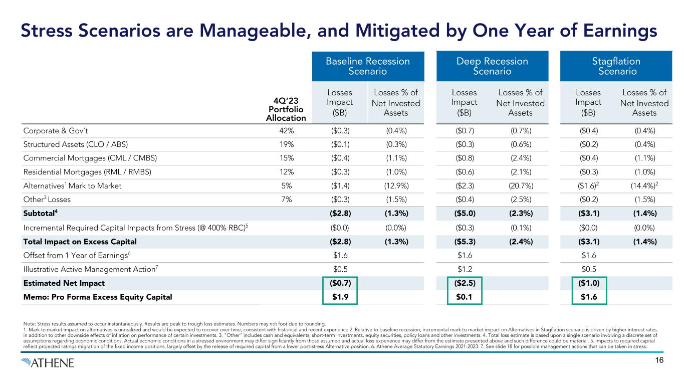 15 Athene Assumptions Sample Historical Recession Data Baseline Recession Scenario Deep Recession Scenario Stagflation Scenario 1990 2001 2008 Euro 2016 COVID 20201 10 Yr US Treasury Yield Down 60% (e.g. ~233bps) Down 83% (e.g. ~322bps) Up 150bps2 Up 4% Down 21% Down 43% Down 84%3 Down 68% Absolute Spreads (BBB / B) 279bps / 802bps4 636bps / 1,789bps4 370bps / 900bps4 240bps / NA 318bps / 1,083bps 642bps / 1,913bps 317bps / 876bps 474bps / 1,139bps Equity Markets (Peak to Trough) (34%) (49%) (25%) (20%) (30%) (49%) (12%) (34%) Fixed Income Defaults (BBB / B) 0.7% / 12.9% 1.4% / 13.7% 0.7% / 9.7% 0.3% / 13.7% 1.0% / 9.2% 0.9% / 7.1% 0.0% / 2.4% 0.1% / 6.2% Housing Price (Peak to Trough) (3%) (27%) (10%) (3%) No Decline (27%)5 No Decline No Decline Commercial Property Price (Peak to Trough) (18%) (26%) (21%) (18%) No Decline (26%) No Decline No Decline6 K ey L ev er s D ri vi ng L os se s Source: Spread –JPMorgan US Liquid Index (JULI) BBB Spread (Libor) for BBB and JPMorgan Domestic HY Spread to Worst for B, except for 1990 and Euro 2016. For 1990 and 1973-74: Federal Reserve Bank of St. Louis, Moody's Seasoned Baa Corporate Bond Yield Relative to Yield on 10- Year Treasury Constant Maturity (BAA10Y and BAA10YM resp.) as JP Morgan indices were not available. For Euro 2016: JPMorgan US Liquid Index (JULI) BBB Spread (Treasury) on Feb 10th 2016 for BBB and JPMorgan Developed Market Single B HY Spread to Worst on Feb 9th, 2016 for B. FI Default – For COVID 2020: Moody’s Monthly Default Report from Moody’s Investor Services. For historical experiences: Moody’s Annual Default Study, Corporate Default and Recovery Rates. Housing Price - Corelogic National HPI index. Commercial Price - CoStar National CPPI index average by property types (Multi-family, Hotel, Industrial, Office, Retail); There is no guarantee that Athene will be able to replicate actual historical recession experience under current market conditions or during future recessions. 1. 10yr US Treasury Yield: Feb 19, 2020 to COVID trough on Aug 4, 2020; Spreads: peak daily absolute spreads during 2020; Equity Markets: SPX pre-COVID peak on Feb 19, 2020 to COVID trough on Mar 23, 2021; FI defaults: peak TTM BBB and B US bond default rates during 2020; Housing price: No decline in TTM Corelogic National HPI index during 2020. 2. 150 bps added to the highest daily 10-year treasury yield observed over 30 business days around quarter end. 3. German 10-year bund yield. 4. Indicative levels, actual absolute spreads determined formulaically based on prevailing market spreads, predetermined spread multipliers and ceilings. 5. Corelogic National HPI down 27% from January 2008 through beginning of 2012 when the Index bottomed. 6. CoStar National CPPI index average by property types during 2020-21 showed appreciation of 7%, however hotel declined by 16% and office declined by 2%. Athene’s Stress Assumptions in Historical Context
