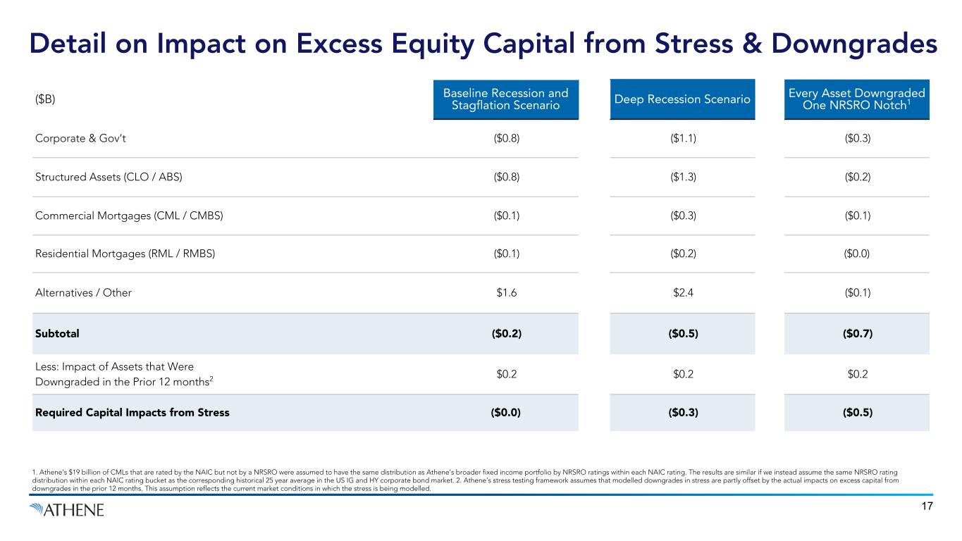 16 4Q’23 Portfolio Allocation Baseline Recession Scenario Deep Recession Scenario Stagflation Scenario Losses Impact ($B) Losses % of Net Invested Assets Losses Impact ($B) Losses % of Net Invested Assets Losses Impact ($B) Losses % of Net Invested Assets Corporate & Gov’t 42% ($0.3) (0.4%) ($0.7) (0.7%) ($0.4) (0.4%) Structured Assets (CLO / ABS) 19% ($0.1) (0.3%) ($0.3) (0.6%) ($0.2) (0.4%) Commercial Mortgages (CML / CMBS) 15% ($0.4) (1.1%) ($0.8) (2.4%) ($0.4) (1.1%) Residential Mortgages (RML / RMBS) 12% ($0.3) (1.0%) ($0.6) (2.1%) ($0.3) (1.0%) Alternatives1 Mark to Market 5% ($1.4) (12.9%) ($2.3) (20.7%) ($1.6)2 (14.4%)2 Other3 Losses 7% ($0.3) (1.5%) ($0.4) (2.5%) ($0.2) (1.5%) Subtotal4 ($2.8) (1.3%) ($5.0) (2.3%) ($3.1) (1.4%) Incremental Required Capital Impacts from Stress (@ 400% RBC)5 ($0.0) (0.0%) ($0.3) (0.1%) ($0.0) (0.0%) Total Impact on Excess Capital ($2.8) (1.3%) ($5.3) (2.4%) ($3.1) (1.4%) Offset from 1 Year of Earnings6 $1.6 $1.6 $1.6 Illustrative Active Management Action7 $0.5 $1.2 $0.5 Estimated Net Impact ($0.7) ($2.5) ($1.0) Memo: Pro Forma Excess Equity Capital $1.9 $0.1 $1.6 Note: Stress results assumed to occur instantaneously. Results are peak to trough loss estimates. Numbers may not foot due to rounding. 1. Mark to market impact on alternatives is unrealized and would be expected to recover over time, consistent with historical and recent experience 2. Relative to baseline recession, incremental mark to market impact on Alternatives in Stagflation scenario is driven by higher interest rates, in addition to other downside effects of inflation on performance of certain investments. 3. "Other" includes cash and equivalents, short-term investments, equity securities, policy loans and other investments. 4. Total loss estimate is based upon a single scenario involving a discrete set of assumptions regarding economic conditions. Actual economic conditions in a stressed environment may differ significantly from those assumed and actual loss experience may differ from the estimate presented above and such difference could be material. 5. Impacts to required capital reflect projected ratings migration of the fixed income positions, largely offset by the release of required capital from a lower post-stress Alternative position. 6. Athene Average Statutory Earnings 2021-2023. 7. See slide 18 for possible management actions that can be taken in stress. Stress Scenarios are Manageable, and Mitigated by One Year of Earnings