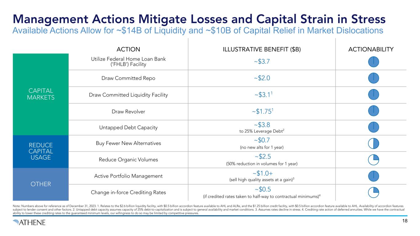 17 ($B) Baseline Recession and Stagflation Scenario Deep Recession Scenario Every Asset Downgraded One NRSRO Notch1 Corporate & Gov’t ($0.8) ($1.1) ($0.3) Structured Assets (CLO / ABS) ($0.8) ($1.3) ($0.2) Commercial Mortgages (CML / CMBS) ($0.1) ($0.3) ($0.1) Residential Mortgages (RML / RMBS) ($0.1) ($0.2) ($0.0) Alternatives / Other $1.6 $2.4 ($0.1) Subtotal ($0.2) ($0.5) ($0.7) Less: Impact of Assets that Were Downgraded in the Prior 12 months2 $0.2 $0.2 $0.2 Required Capital Impacts from Stress ($0.0) ($0.3) ($0.5) 1. Athene’s $19 billion of CMLs that are rated by the NAIC but not by a NRSRO were assumed to have the same distribution as Athene’s broader fixed income portfolio by NRSRO ratings within each NAIC rating. The results are similar if we instead assume the same NRSRO rating distribution within each NAIC rating bucket as the corresponding historical 25 year average in the US IG and HY corporate bond market. 2. Athene’s stress testing framework assumes that modelled downgrades in stress are partly offset by the actual impacts on excess capital from downgrades in the prior 12 months. This assumption reflects the current market conditions in which the stress is being modelled. Detail on Impact on Excess Equity Capital from Stress & Downgrades