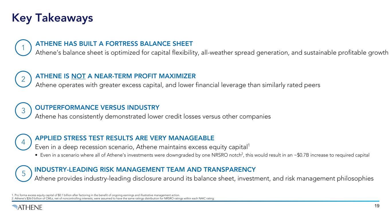 Available Actions Allow for ~$14B of Liquidity and ~$10B of Capital Relief in Market Dislocations 18 ACTION ILLUSTRATIVE BENEFIT ($B) ACTIONABILITY CAPITAL MARKETS Utilize Federal Home Loan Bank (‘FHLB’) Facility ~$3.7 Draw Committed Repo ~$2.0 Draw Committed Liquidity Facility ~$3.11 Draw Revolver ~$1.751 Untapped Debt Capacity ~$3.8 to 25% Leverage Debt2 REDUCE CAPITAL USAGE Buy Fewer New Alternatives ~$0.7 (no new alts for 1 year) Reduce Organic Volumes ~$2.5 (50% reduction in volumes for 1 year) OTHER Active Portfolio Management ~$1.0+ (sell high quality assets at a gain)3 Change in-force Crediting Rates ~$0.5 (if credited rates taken to half-way to contractual minimums)4 Note: Numbers above for reference as of December 31, 2023. 1. Relates to the $2.6 billion liquidity facility, with $0.5 billion accordion feature available to AHL and ALRe, and the $1.25 billion credit facility, with $0.5 billion accordion feature available to AHL. Availability of accordion features subject to lender consent and other factors. 2. Untapped debt capacity assumes capacity of 25% debt-to-capitalization and is subject to general availability and market conditions. 3. Assumes rates decline in stress. 4. Crediting rate action of deferred annuities. While we have the contractual ability to lower these crediting rates to the guaranteed minimum levels, our willingness to do so may be limited by competitive pressures. Management Actions Mitigate Losses and Capital Strain in Stress