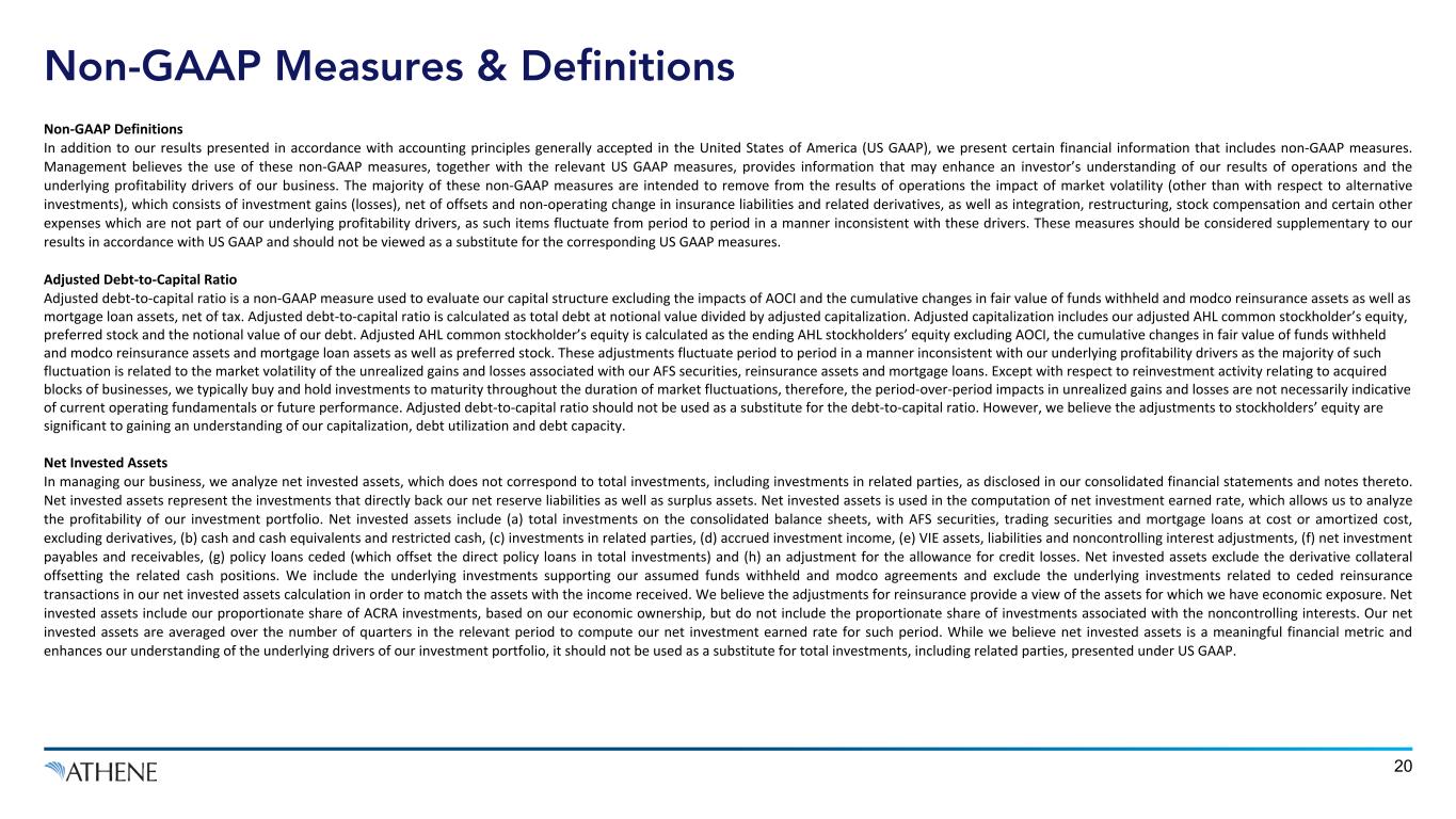 Non-GAAP Definitions In addition to our results presented in accordance with accounting principles generally accepted in the United States of America (US GAAP), we present certain financial information that includes non-GAAP measures. Management believes the use of these non-GAAP measures, together with the relevant US GAAP measures, provides information that may enhance an investor’s understanding of our results of operations and the underlying profitability drivers of our business. The majority of these non-GAAP measures are intended to remove from the results of operations the impact of market volatility (other than with respect to alternative investments), which consists of investment gains (losses), net of offsets and non-operating change in insurance liabilities and related derivatives, as well as integration, restructuring, stock compensation and certain other expenses which are not part of our underlying profitability drivers, as such items fluctuate from period to period in a manner inconsistent with these drivers. These measures should be considered supplementary to our results in accordance with US GAAP and should not be viewed as a substitute for the corresponding US GAAP measures. Adjusted Debt-to-Capital Ratio Adjusted debt-to-capital ratio is a non-GAAP measure used to evaluate our capital structure excluding the impacts of AOCI and the cumulative changes in fair value of funds withheld and modco reinsurance assets as well as mortgage loan assets, net of tax. Adjusted debt-to-capital ratio is calculated as total debt at notional value divided by adjusted capitalization. Adjusted capitalization includes our adjusted AHL common stockholder’s equity, preferred stock and the notional value of our debt. Adjusted AHL common stockholder’s equity is calculated as the ending AHL stockholders’ equity excluding AOCI, the cumulative changes in fair value of funds withheld and modco reinsurance assets and mortgage loan assets as well as preferred stock. These adjustments fluctuate period to period in a manner inconsistent with our underlying profitability drivers as the majority of such fluctuation is related to the market volatility of the unrealized gains and losses associated with our AFS securities, reinsurance assets and mortgage loans. Except with respect to reinvestment activity relating to acquired blocks of businesses, we typically buy and hold investments to maturity throughout the duration of market fluctuations, therefore, the period-over-period impacts in unrealized gains and losses are not necessarily indicative of current operating fundamentals or future performance. Adjusted debt-to-capital ratio should not be used as a substitute for the debt-to-capital ratio. However, we believe the adjustments to stockholders’ equity are significant to gaining an understanding of our capitalization, debt utilization and debt capacity. Net Invested Assets In managing our business, we analyze net invested assets, which does not correspond to total investments, including investments in related parties, as disclosed in our consolidated financial statements and notes thereto. Net invested assets represent the investments that directly back our net reserve liabilities as well as surplus assets. Net invested assets is used in the computation of net investment earned rate, which allows us to analyze the profitability of our investment portfolio. Net invested assets include (a) total investments on the consolidated balance sheets, with AFS securities, trading securities and mortgage loans at cost or amortized cost, excluding derivatives, (b) cash and cash equivalents and restricted cash, (c) investments in related parties, (d) accrued investment income, (e) VIE assets, liabilities and noncontrolling interest adjustments, (f) net investment payables and receivables, (g) policy loans ceded (which offset the direct policy loans in total investments) and (h) an adjustment for the allowance for credit losses. Net invested assets exclude the derivative collateral offsetting the related cash positions. We include the underlying investments supporting our assumed funds withheld and modco agreements and exclude the underlying investments related to ceded reinsurance transactions in our net invested assets calculation in order to match the assets with the income received. We believe the adjustments for reinsurance provide a view of the assets for which we have economic exposure. Net invested assets include our proportionate share of ACRA investments, based on our economic ownership, but do not include the proportionate share of investments associated with the noncontrolling interests. Our net invested assets are averaged over the number of quarters in the relevant period to compute our net investment earned rate for such period. While we believe net invested assets is a meaningful financial metric and enhances our understanding of the underlying drivers of our investment portfolio, it should not be used as a substitute for total investments, including related parties, presented under US GAAP. Non-GAAP Measures & Definitions 20