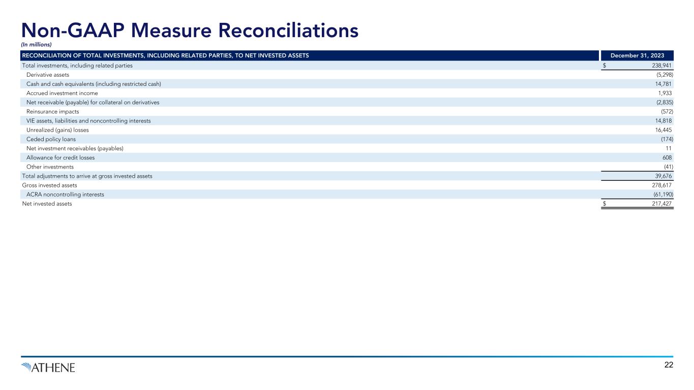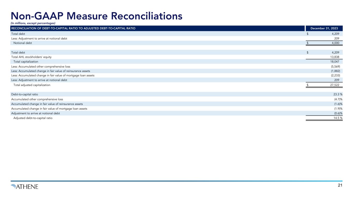 Non-GAAP Measure Reconciliations (In millions, except percentages) 21 RECONCILIATION OF DEBT-TO-CAPITAL RATIO TO ADJUSTED DEBT-TO-CAPITAL RATIO December 31, 2023 Total debt $ 4,209 Less: Adjustment to arrive at notional debt 209 Notional debt $ 4,000 Total debt $ 4,209 Total AHL stockholders' equity 13,838 Total capitalization 18,047 Less: Accumulated other comprehensive loss (5,569) Less: Accumulated change in fair value of reinsurance assets (1,882) Less: Accumulated change in fair value of mortgage loan assets (2,233) Less: Adjustment to arrive at notional debt 209 Total adjusted capitalization $ 27,522 Debt-to-capital ratio 23.3 % Accumulated other comprehensive loss (4.7) % Accumulated change in fair value of reinsurance assets (1.6) % Accumulated change in fair value of mortgage loan assets (1.9) % Adjustment to arrive at notional debt (0.6) % Adjusted debt-to-capital ratio 14.5 %