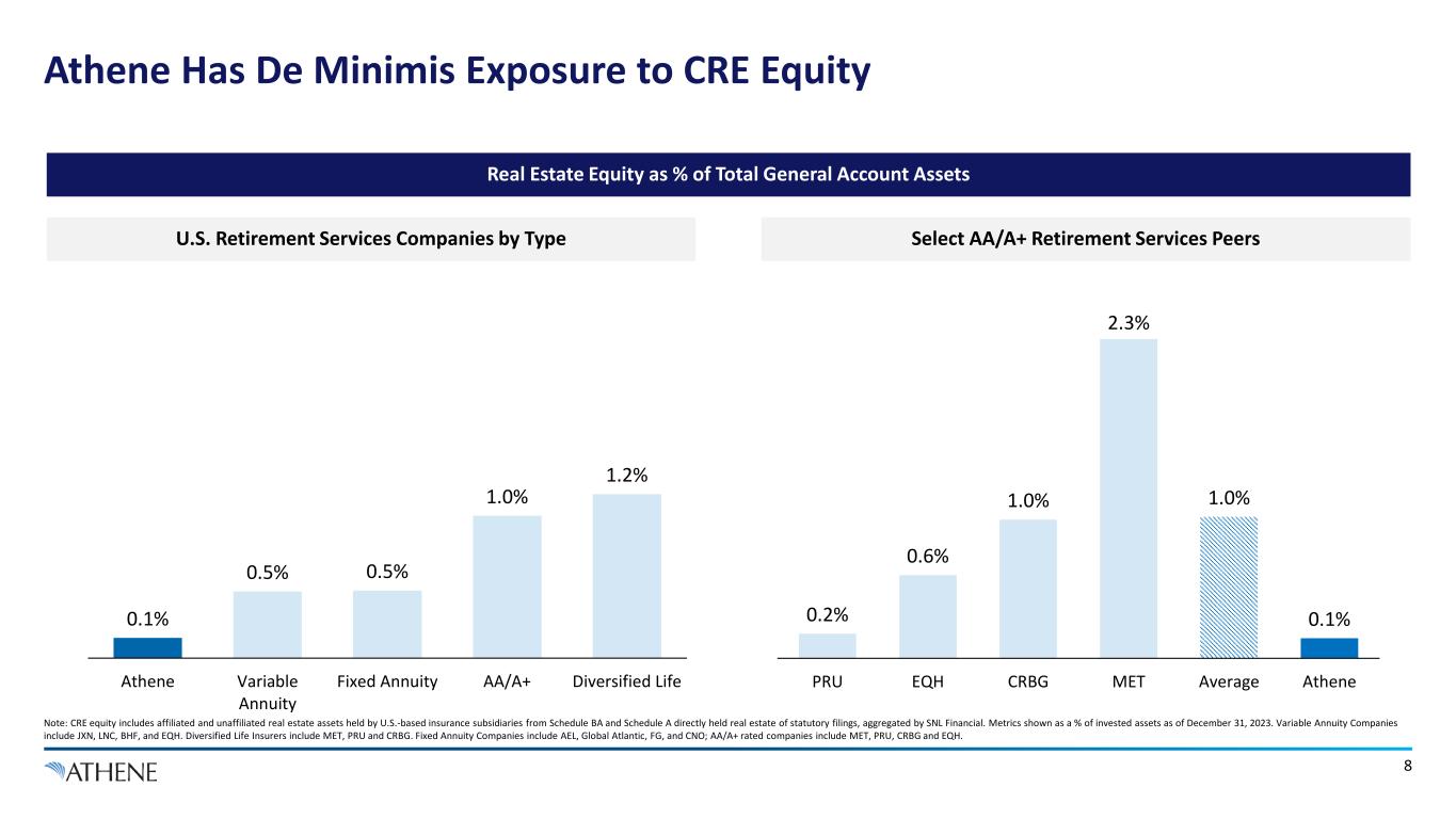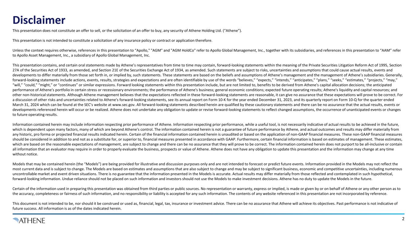 Disclaimer This presentation does not constitute an offer to sell, or the solicitation of an offer to buy, any security of Athene Holding Ltd. (“Athene”). This presentation is not intended to constitute a solicitation of any insurance policy or contract or application therefore. Unless the context requires otherwise, references in this presentation to “Apollo," "AGM" and "AGM HoldCo" refer to Apollo Global Management, Inc., together with its subsidiaries, and references in this presentation to “AAM” refer to Apollo Asset Management, Inc., a subsidiary of Apollo Global Management, Inc. This presentation contains, and certain oral statements made by Athene’s representatives from time to time may contain, forward-looking statements within the meaning of the Private Securities Litigation Reform Act of 1995, Section 27A of the Securities Act of 1933, as amended, and Section 21E of the Securities Exchange Act of 1934, as amended. Such statements are subject to risks, uncertainties and assumptions that could cause actual results, events and developments to differ materially from those set forth in, or implied by, such statements. These statements are based on the beliefs and assumptions of Athene’s management and the management of Athene’s subsidiaries. Generally, forward-looking statements include actions, events, results, strategies and expectations and are often identifiable by use of the words “believes,” “expects,” “intends,” “anticipates,” “plans,” “seeks,” “estimates,” “projects,” “may,” “will,” “could,” “might,” or “continues” or similar expressions. Forward looking statements within this presentation include, but are not limited to, benefits to be derived from Athene's capital allocation decisions; the anticipated performance of Athene's portfolio in certain stress or recessionary environments; the performance of Athene's business; general economic conditions; expected future operating results; Athene's liquidity and capital resources; and other non-historical statements. Although Athene management believes that the expectations reflected in these forward-looking statements are reasonable, it can give no assurance that these expectations will prove to be correct. For a discussion of other risks and uncertainties related to Athene's forward-looking statements, see its annual report on Form 10-K for the year ended December 31, 2023, and its quarterly report on Form 10-Q for the quarter ended March 31, 2024 which can be found at the SEC’s website at www.sec.gov. All forward-looking statements described herein are qualified by these cautionary statements and there can be no assurance that the actual results, events or developments referenced herein will occur or be realized. Athene does not undertake any obligation to update or revise forward-looking statements to reflect changed assumptions, the occurrence of unanticipated events or changes to future operating results. Information contained herein may include information respecting prior performance of Athene. Information respecting prior performance, while a useful tool, is not necessarily indicative of actual results to be achieved in the future, which is dependent upon many factors, many of which are beyond Athene's control. The information contained herein is not a guarantee of future performance by Athene, and actual outcomes and results may differ materially from any historic, pro forma or projected financial results indicated herein. Certain of the financial information contained herein is unaudited or based on the application of non-GAAP financial measures. These non-GAAP financial measures should be considered in addition to and not as a substitute for, or superior to, financial measures presented in accordance with GAAP. Furthermore, certain financial information is based on estimates of management. These estimates, which are based on the reasonable expectations of management, are subject to change and there can be no assurance that they will prove to be correct. The information contained herein does not purport to be all-inclusive or contain all information that an evaluator may require in order to properly evaluate the business, prospects or value of Athene. Athene does not have any obligation to update this presentation and the information may change at any time without notice. Models that may be contained herein (the “Models”) are being provided for illustrative and discussion purposes only and are not intended to forecast or predict future events. Information provided in the Models may not reflect the most current data and is subject to change. The Models are based on estimates and assumptions that are also subject to change and may be subject to significant business, economic and competitive uncertainties, including numerous uncontrollable market and event driven situations. There is no guarantee that the information presented in the Models is accurate. Actual results may differ materially from those reflected and contemplated in such hypothetical, forward-looking information. Undue reliance should not be placed on such information and investors should not use the Models to make investment decisions. Athene has no duty to update the Models in the future. Certain of the information used in preparing this presentation was obtained from third parties or public sources. No representation or warranty, express or implied, is made or given by or on behalf of Athene or any other person as to the accuracy, completeness or fairness of such information, and no responsibility or liability is accepted for any such information. The contents of any website referenced in this presentation are not incorporated by reference. This document is not intended to be, nor should it be construed or used as, financial, legal, tax, insurance or investment advice. There can be no assurance that Athene will achieve its objectives. Past performance is not indicative of future succ