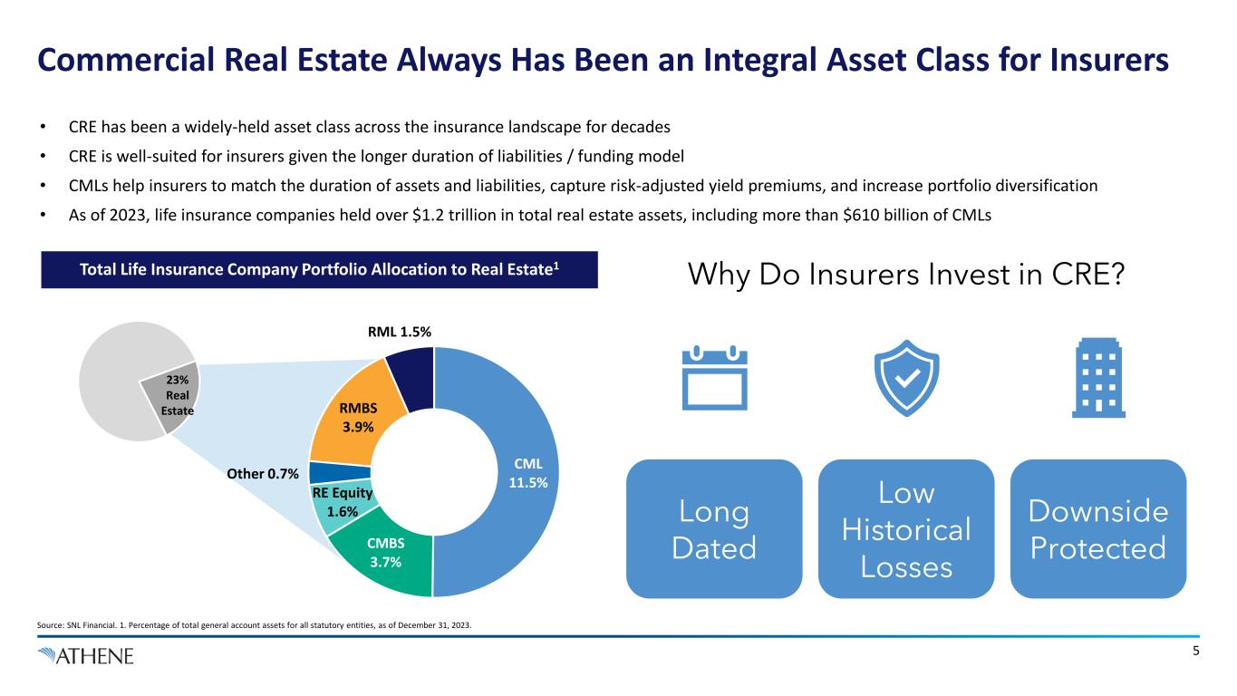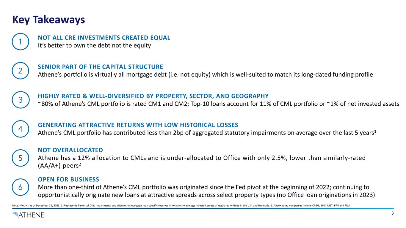 Key Takeaways Note: Metrics as of December 31, 2023. 1. Represents historical CML impairments and changes in mortgage loan specific reserves in relation to average invested assets of regulated entities in the U.S. and Bermuda. 2. AA/A+ rated companies include CRBG, LNC, MET, PFG and PRU. 3 GENERATING ATTRACTIVE RETURNS WITH LOW HISTORICAL LOSSES Athene’s CML portfolio has contributed less than 2bp of aggregated statutory impairments on average over the last 5 years14 SENIOR PART OF THE CAPITAL STRUCTURE Athene’s portfolio is virtually all mortgage debt (i.e. not equity) which is well-suited to match its long-dated funding profile 2 NOT OVERALLOCATED Athene has a 12% allocation to CMLs and is under-allocated to Office with only 2.5%, lower than similarly-rated (AA/A+) peers2 5 OPEN FOR BUSINESS More than one-third of Athene’s CML portfolio was originated since the Fed pivot at the beginning of 2022; continuing to opportunistically originate new loans at attractive spreads across select property types (no Office loan originations in 2023) 6 NOT ALL CRE INVESTMENTS CREATED EQUAL It’s better to own the debt not the equity1 3 HIGHLY RATED & WELL-DIVERSIFIED BY PROPERTY, SECTOR, AND GEOGRAPHY ~80% of Athene’s CML portfolio is rated CM1 and CM2; Top-10 loans account for 11% of CML portfolio or ~1% of net invested assets