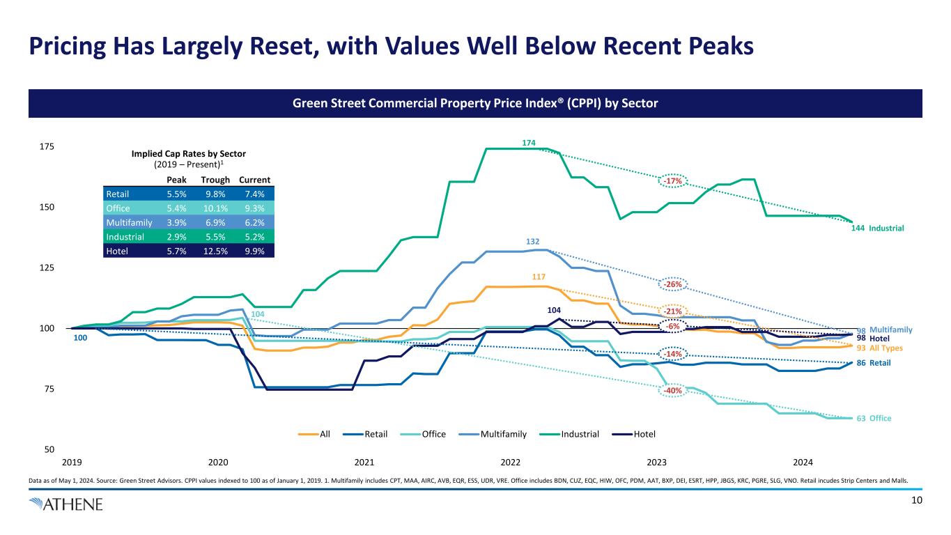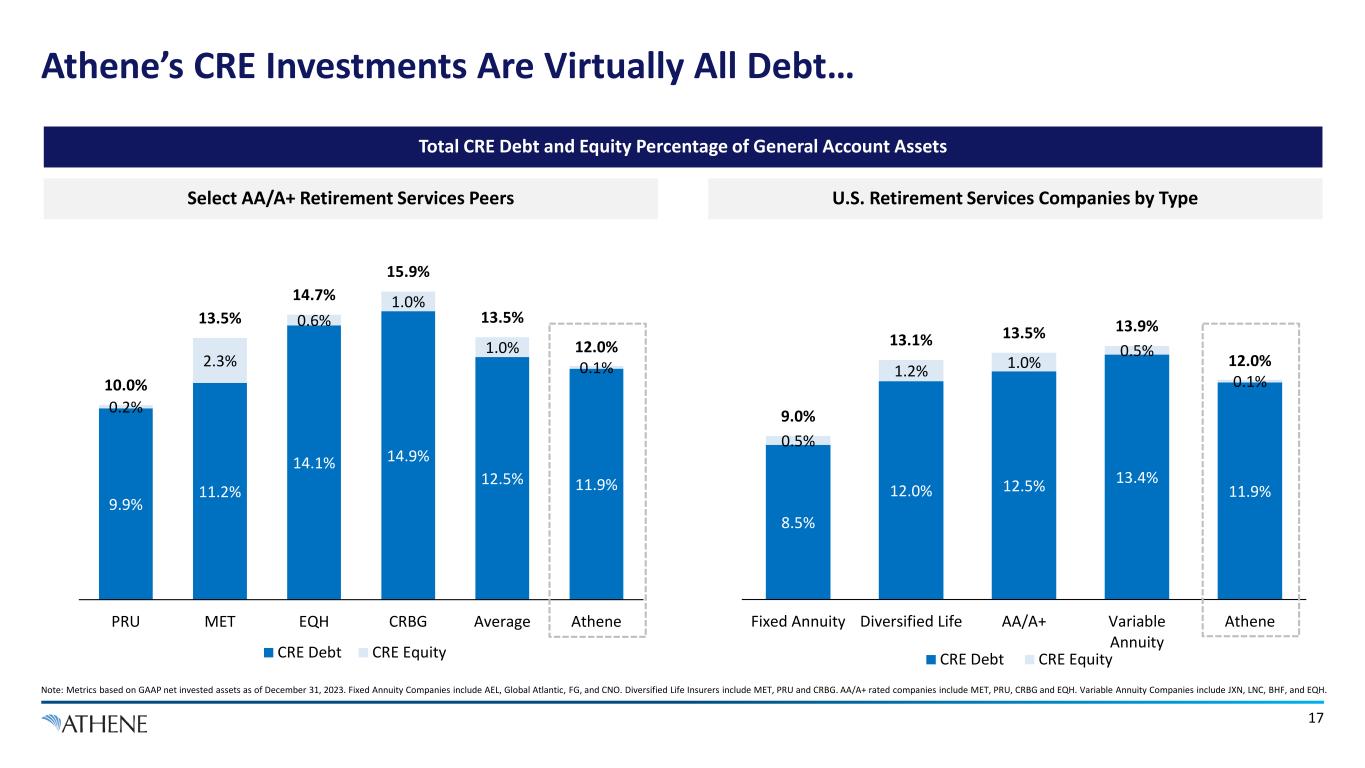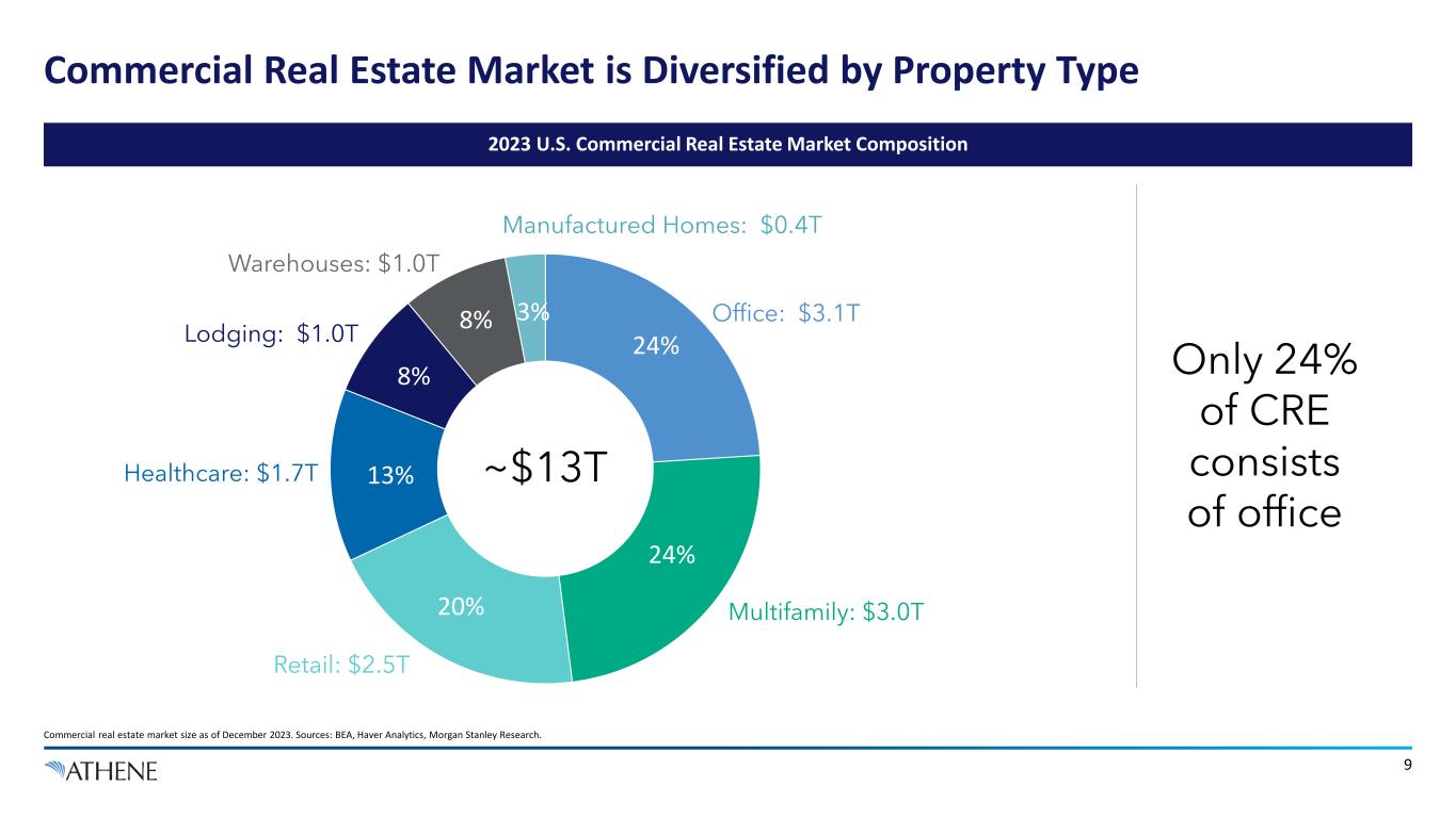 0.2% 0.6% 1.0% 2.3% 1.0% 0.1% PRU EQH CRBG MET Average Athene 0.1% 0.5% 0.5% 1.0% 1.2% Athene Variable Annuity Fixed Annuity AA/A+ Diversified Life Athene Has De Minimis Exposure to CRE Equity Note: CRE equity includes affiliated and unaffiliated real estate assets held by U.S.-based insurance subsidiaries from Schedule BA and Schedule A directly held real estate of statutory filings, aggregated by SNL Financial. Metrics shown as a % of invested assets as of December 31, 2023. Variable Annuity Companies include JXN, LNC, BHF, and EQH. Diversified Life Insurers include MET, PRU and CRBG. Fixed Annuity Companies include AEL, Global Atlantic, FG, and CNO; AA/A+ rated companies include MET, PRU, CRBG and EQH. Real Estate Equity as % of Total General Account Assets U.S. Retirement Services Companies by Type Select AA/A+ Retirement Services Peers 8
