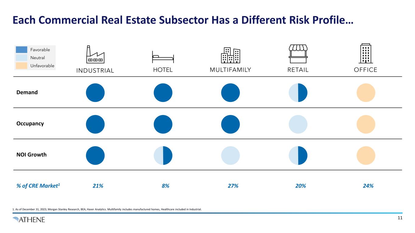 24% 24% 20% 13% 8% 8% 3% 9 Commercial Real Estate Market is Diversified by Property Type Commercial real estate market size as of December 2023. Sources: BEA, Haver Analytics, Morgan Stanley Research. Office: $3.1T Multifamily: $3.0T Retail: $2.5T Healthcare: $1.7T Lodging: $1.0T Warehouses: $1.0T Manufactured Homes: $0.4T Only 24% of CRE consists of office 2023 U.S. Commercial Real Estate Market Composition ~$13T