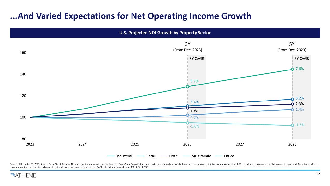 80 100 120 140 160 2023 2024 2025 2026 2027 2028 12 Data as of December 31, 2023. Source: Green Street Advisors. Net operating income growth forecast based on Green Street’s model that incorporates key demand and supply drivers such as employment, office-use employment, real GDP, retail sales, e-commerce, real disposable income, brick & mortar retail sales, corporate profits, and recession indicators to adjust demand and supply for each sector. CAGR calculation assumes base of 100 at Q4 of 2023. 3Y (From Dec. 2023) 5Y (From Dec. 2023) 8.7% 3.4% 0.7% -1.6% 2.9% 7.6% 3.2% 1.4% -1.6% 2.3% U.S. Projected NOI Growth by Property Sector ...And Varied Expectations for Net Operating Income Growth 3Y CAGR 5Y CAGR Industrial Retail Hotel Multifamily Office