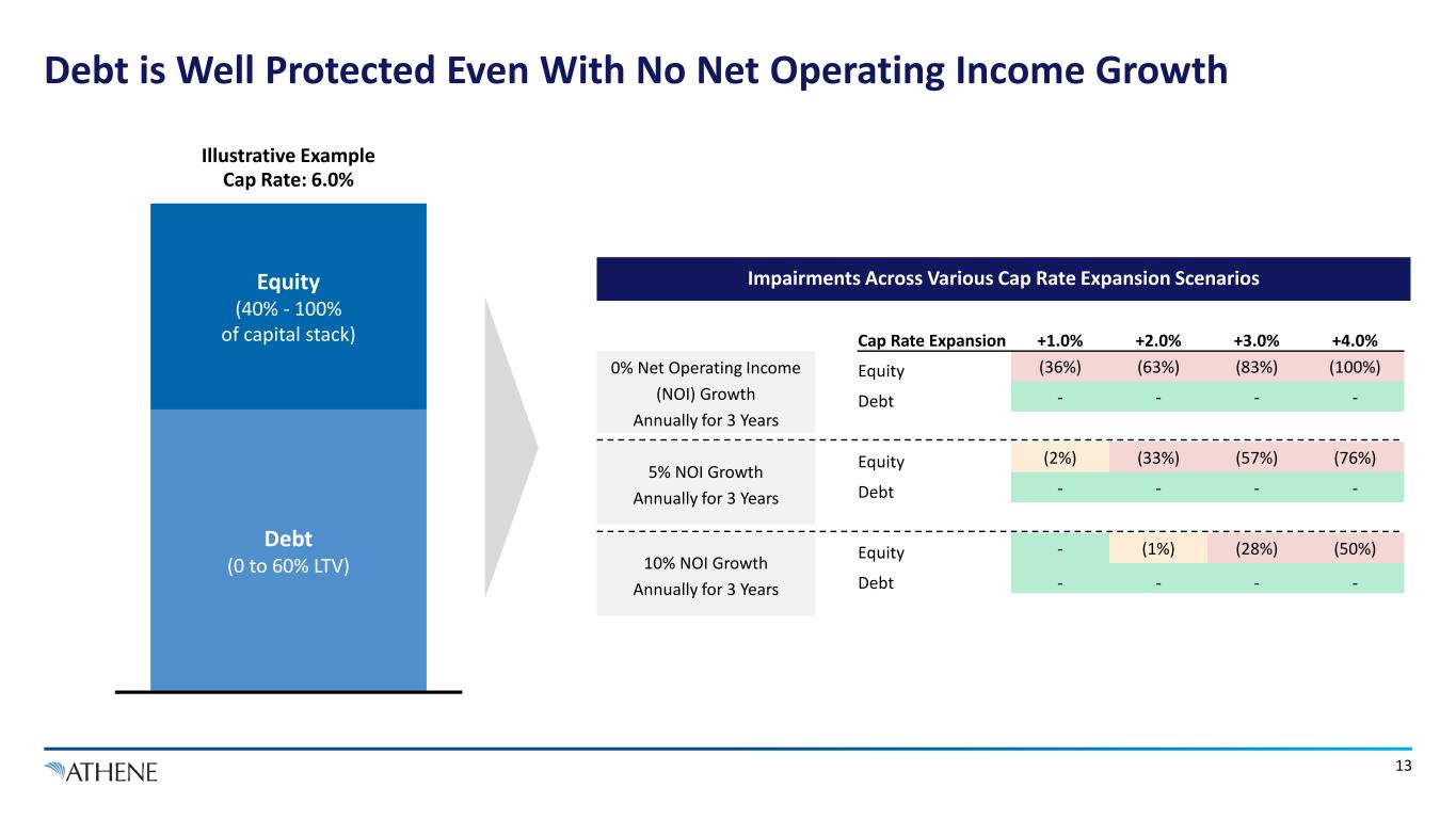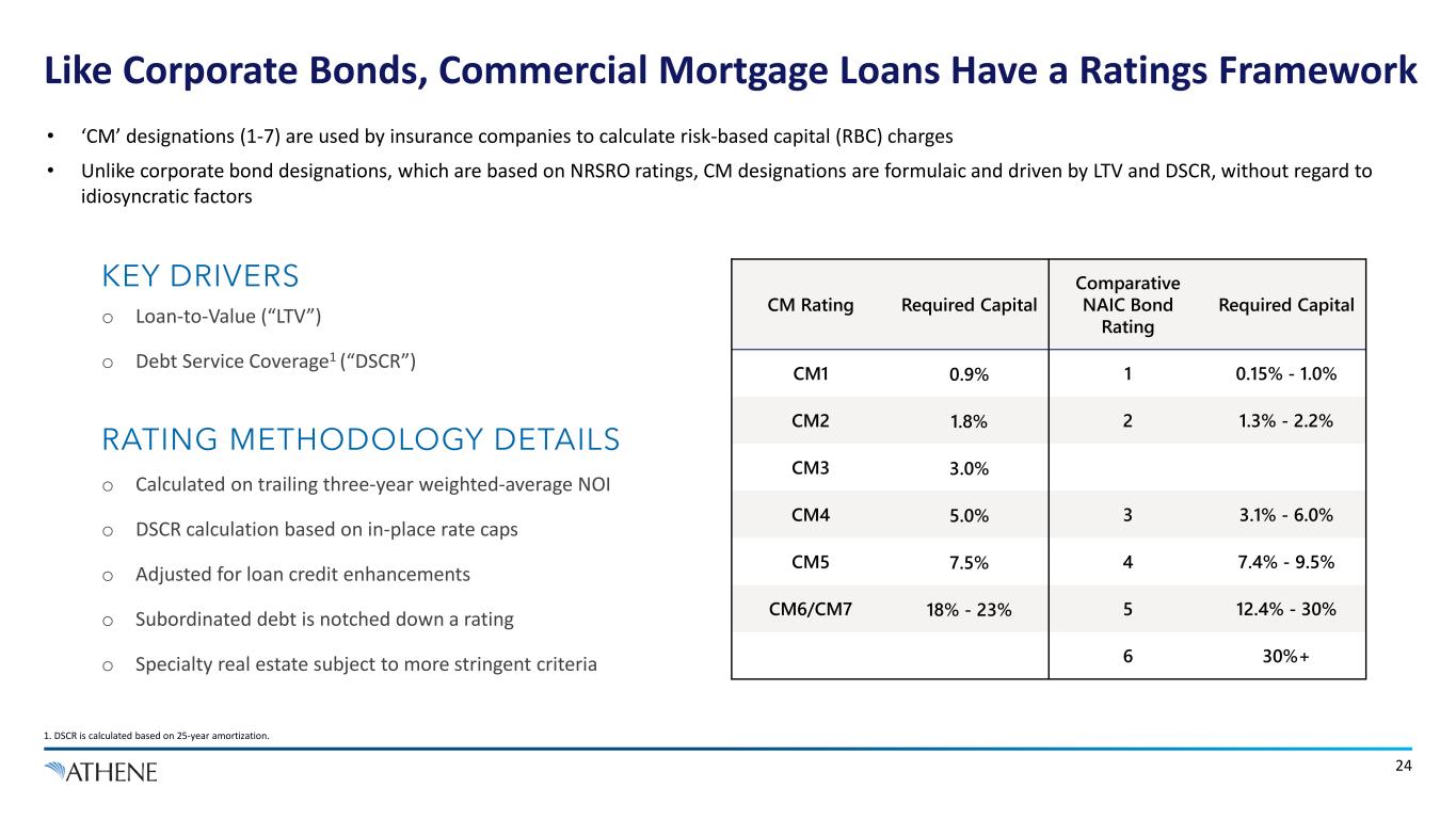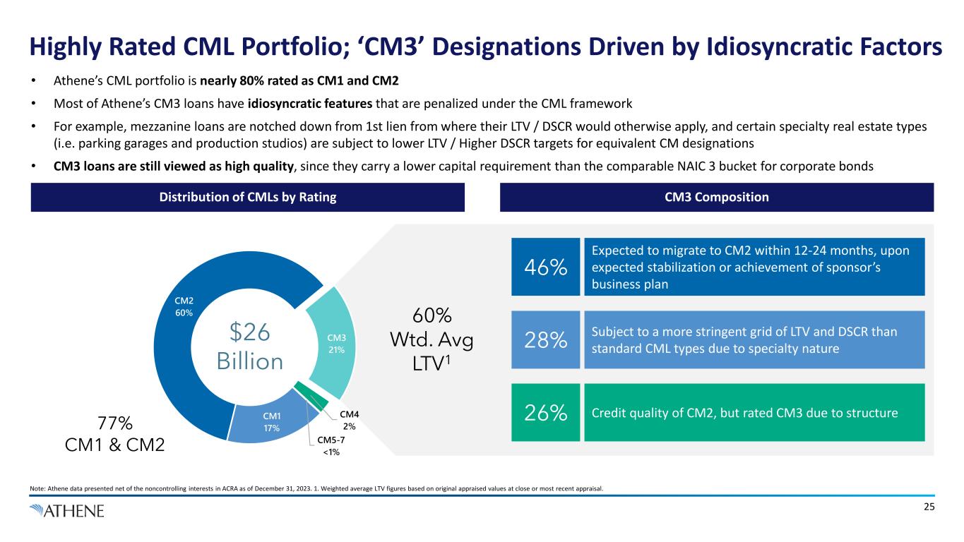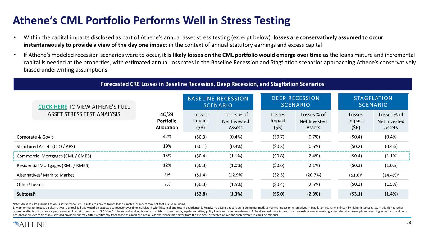 4Q’23 Portfolio Allocation BASELINE RECESSION SCENARIO DEEP RECESSION SCENARIO STAGFLATION SCENARIO Losses Impact ($B) Losses % of Net Invested Assets Losses Impact ($B) Losses % of Net Invested Assets Losses Impact ($B) Losses % of Net Invested Assets Corporate & Gov’t 42% ($0.3) (0.4%) ($0.7) (0.7%) ($0.4) (0.4%) Structured Assets (CLO / ABS) 19% ($0.1) (0.3%) ($0.3) (0.6%) ($0.2) (0.4%) Commercial Mortgages (CML / CMBS) 15% ($0.4) (1.1%) ($0.8) (2.4%) ($0.4) (1.1%) Residential Mortgages (RML / RMBS) 12% ($0.3) (1.0%) ($0.6) (2.1%) ($0.3) (1.0%) Alternatives1 Mark to Market 5% ($1.4) (12.9%) ($2.3) (20.7%) ($1.6)2 (14.4%)2 Other3 Losses 7% ($0.3) (1.5%) ($0.4) (2.5%) ($0.2) (1.5%) Subtotal4 ($2.8) (1.3%) ($5.0) (2.3%) ($3.1) (1.4%) Athene’s CML Portfolio Performs Well in Stress Testing Note: Stress results assumed to occur instantaneously. Results are peak to trough loss estimates. Numbers may not foot due to rounding. 1. Mark to market impact on alternatives is unrealized and would be expected to recover over time, consistent with historical and recent experience 2. Relative to baseline recession, incremental mark to market impact on Alternatives in Stagflation scenario is driven by higher interest rates, in addition to other downside effects of inflation on performance of certain investments. 3. "Other" includes cash and equivalents, short-term investments, equity securities, policy loans and other investments. 4. Total loss estimate is based upon a single scenario involving a discrete set of assumptions regarding economic conditions. Actual economic conditions in a stressed environment may differ significantly from those assumed and actual loss experience may differ from the estimate presented above and such difference could be material. 23 Forecasted CRE Losses in Baseline Recession, Deep Recession, and Stagflation Scenarios • Within the capital impacts disclosed as part of Athene’s annual asset stress testing (excerpt below), losses are conservatively assumed to occur instantaneously to provide a view of the day one impact in the context of annual statutory earnings and excess capital • If Athene’s modeled recession scenarios were to occur, it is likely losses on the CML portfolio would emerge over time as the loans mature and incremental capital is needed at the properties, with estimated annual loss rates in the Baseline Recession and Stagflation scenarios approaching Athene’s conservatively biased underwriting assumptions CLICK HERE TO VIEW ATHENE’S FULL ASSET STRESS TEST ANALYSIS