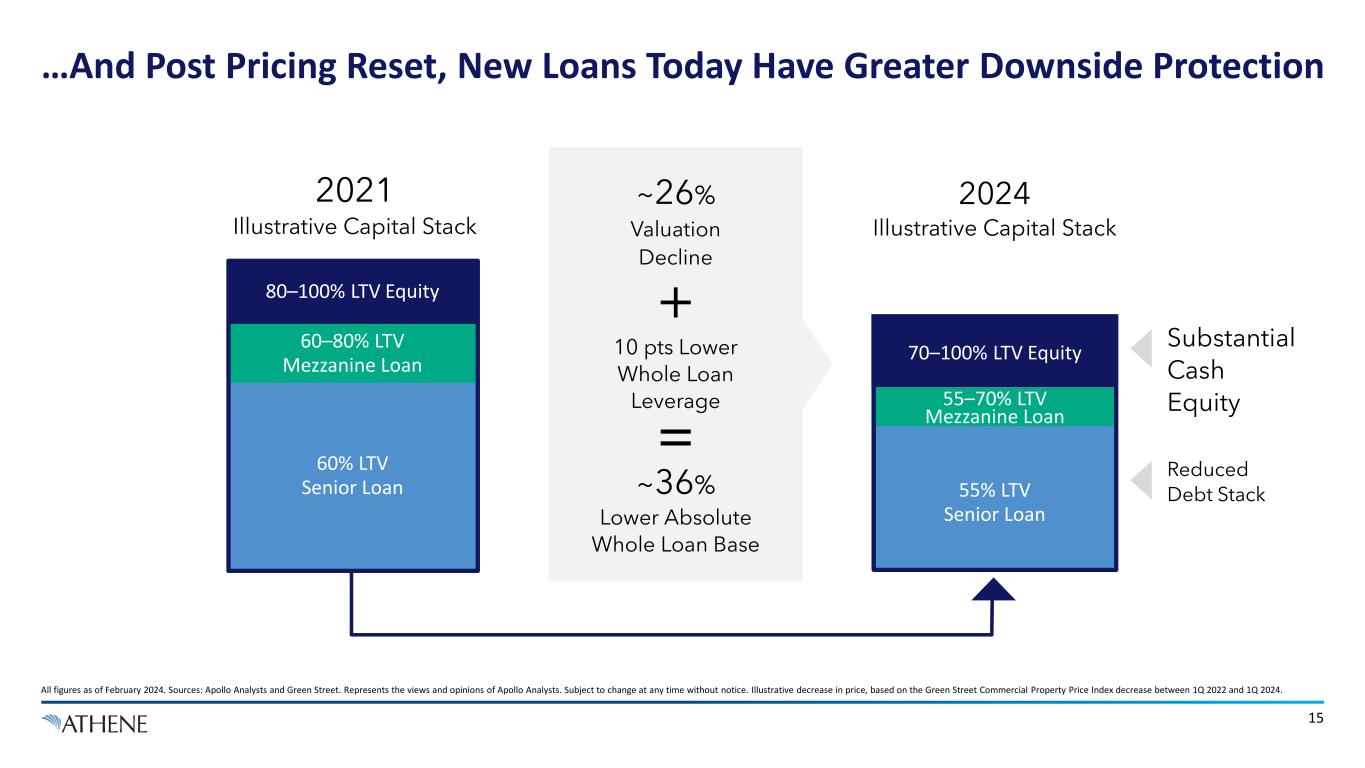 15 …And Post Pricing Reset, New Loans Today Have Greater Downside Protection All figures as of February 2024. Sources: Apollo Analysts and Green Street. Represents the views and opinions of Apollo Analysts. Subject to change at any time without notice. Illustrative decrease in price, based on the Green Street Commercial Property Price Index decrease between 1Q 2022 and 1Q 2024. 2021 Illustrative Capital Stack 2024 Illustrative Capital Stack Substantial Cash Equity Reduced Debt Stack 60% LTV Senior Loan 60–80% LTV Mezzanine Loan 80–100% LTV Equity ~26% Valuation Decline 10 pts Lower Whole Loan Leverage ~36% Lower Absolute Whole Loan Base 55% LTV Senior Loan 55–70% LTV Mezzanine Loan 70–100% LTV Equity