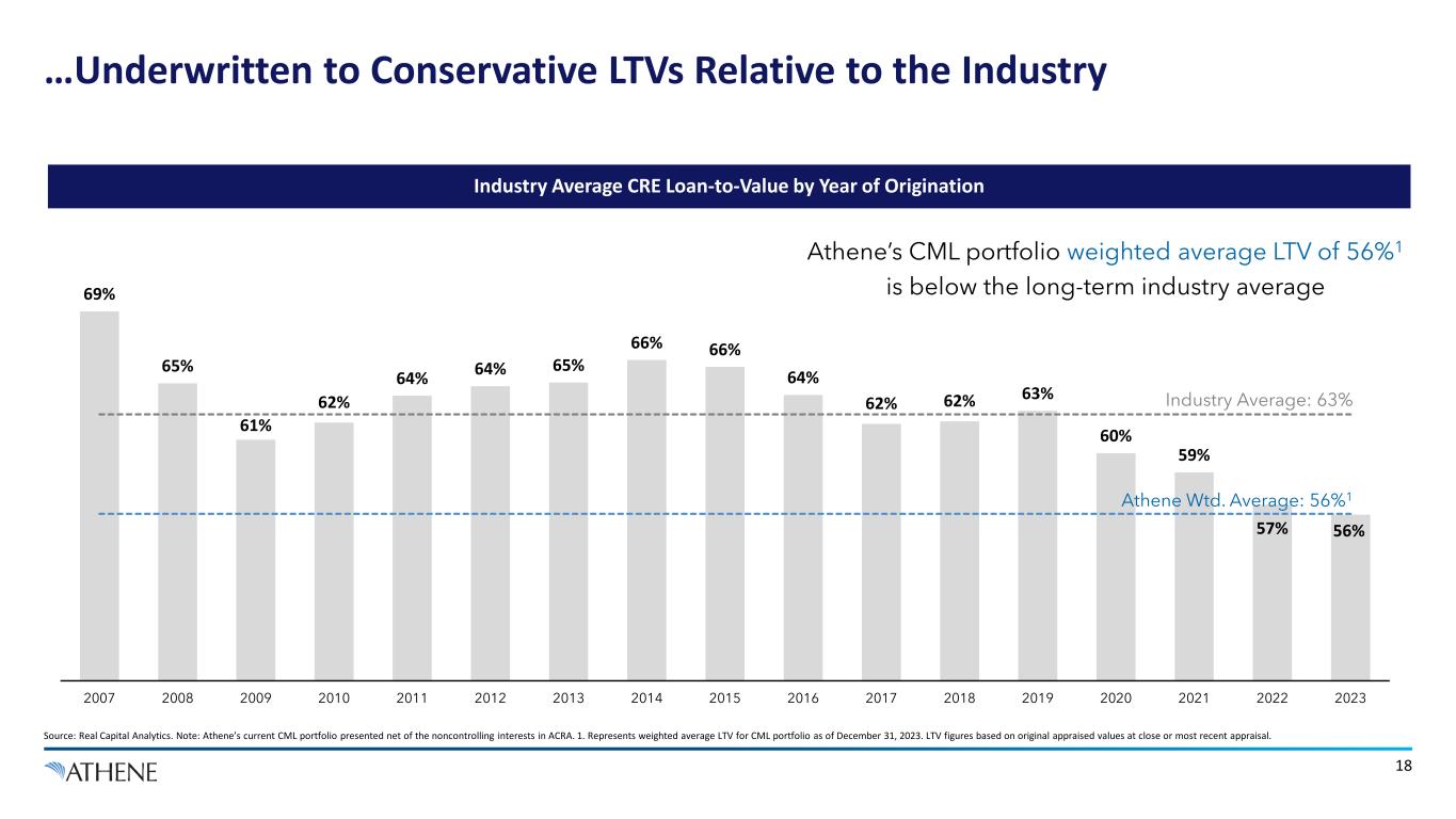 8.5% 12.0% 12.5% 13.4% 11.9% 0.5% 1.2% 1.0% 0.5% 0.1% 9.0% 13.1% 13.5% 13.9% 12.0% Fixed Annuity Diversified Life AA/A+ Variable Annuity Athene CRE Debt CRE Equity 9.9% 11.2% 14.1% 14.9% 12.5% 11.9% 0.2% 2.3% 0.6% 1.0% 1.0% 0.1% 10.0% 13.5% 14.7% 15.9% 13.5% 12.0% PRU MET EQH CRBG Average Athene CRE Debt CRE Equity Athene’s CRE Investments Are Virtually All Debt… Note: Metrics based on GAAP net invested assets as of December 31, 2023. Fixed Annuity Companies include AEL, Global Atlantic, FG, and CNO. Diversified Life Insurers include MET, PRU and CRBG. AA/A+ rated companies include MET, PRU, CRBG and EQH. Variable Annuity Companies include JXN, LNC, BHF, and EQH. Total CRE Debt and Equity Percentage of General Account Assets Select AA/A+ Retirement Services Peers U.S. Retirement Services Companies by Type 17