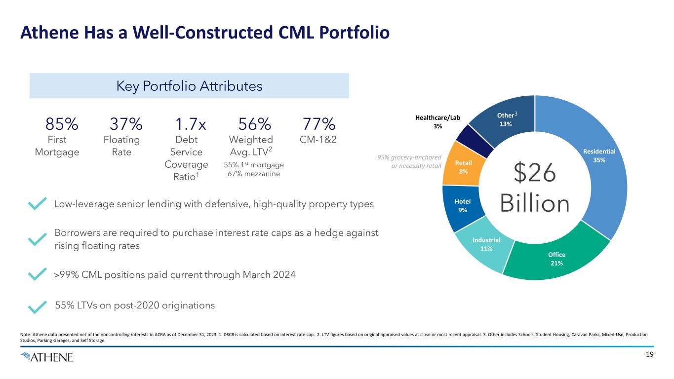 69% 65% 61% 62% 64% 64% 65% 66% 66% 64% 62% 62% 63% 60% 59% 57% 56% 2007 2008 2009 2010 2011 2012 2013 2014 2015 2016 2017 2018 2019 2020 2021 2022 2023 …Underwritten to Conservative LTVs Relative to the Industry Source: Real Capital Analytics. Note: Athene’s current CML portfolio presented net of the noncontrolling interests in ACRA. 1. Represents weighted average LTV for CML portfolio as of December 31, 2023. LTV figures based on original appraised values at close or most recent appraisal. 18 Industry Average CRE Loan-to-Value by Year of Origination Athene’s CML portfolio weighted average LTV of 56%1 is below the long-term industry average Industry Average: 63% Athene Wtd. Average: 56%1