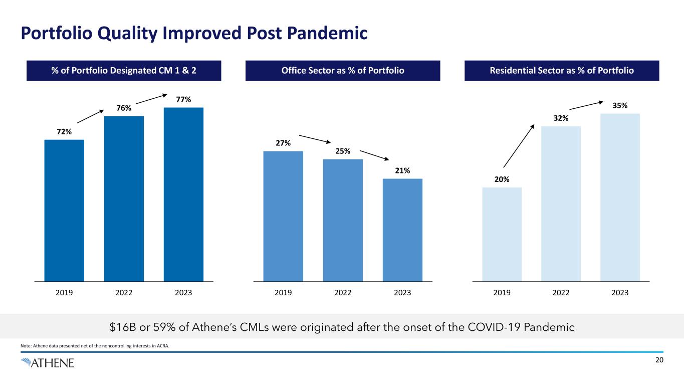 Athene Has a Well-Constructed CML Portfolio Residential 35% Office 21% Industrial 11% Hotel 9% Retail 8% Healthcare/Lab 3% Other 13% Note: Athene data presented net of the noncontrolling interests in ACRA as of December 31, 2023. 1. DSCR is calculated based on interest rate cap. 2. LTV figures based on original appraised values at close or most recent appraisal. 3. Other includes Schools, Student Housing, Caravan Parks, Mixed-Use, Production Studios, Parking Garages, and Self Storage. 19 Key Portfolio Attributes Low-leverage senior lending with defensive, high-quality property types Borrowers are required to purchase interest rate caps as a hedge against rising floating rates $26 Billion 3 >99% CML positions paid current through March 2024 85% First Mortgage 1.7x Debt Service Coverage Ratio1 56% Weighted Avg. LTV2 77% CM-1&2 37% Floating Rate 55% 1st mortgage 67% mezzanine 55% LTVs on post-2020 originations 95% grocery-anchored or necessity retail