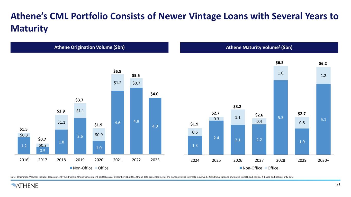 Portfolio Quality Improved Post Pandemic Note: Athene data presented net of the noncontrolling interests in ACRA. 20 $16B or 59% of Athene’s CMLs were originated after the onset of the COVID-19 Pandemic % of Portfolio Designated CM 1 & 2 Office Sector as % of Portfolio Residential Sector as % of Portfolio 72% 76% 77% 2019 2022 2023 27% 25% 21% 2019 2022 2023 20% 32% 35% 2019 2022 2023