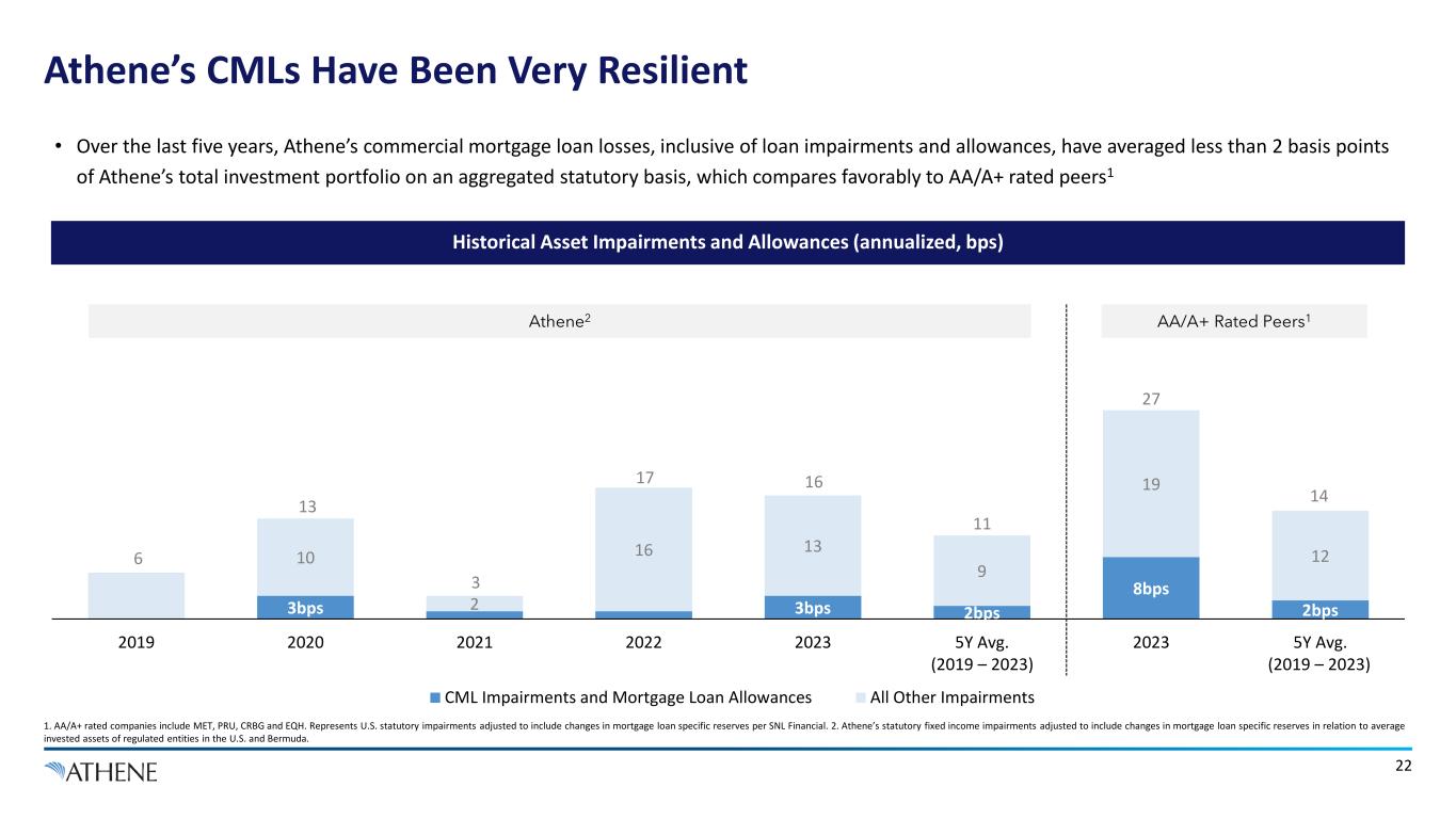 Athene Origination Volume ($bn) Athene’s CML Portfolio Consists of Newer Vintage Loans with Several Years to Maturity Note: Origination Volumes includes loans currently held within Athene’s investment portfolio as of December 31, 2023. Athene data presented net of the noncontrolling interests in ACRA. 1. 2016 Includes loans originated in 2016 and earlier. 2. Based on final maturity date. 21 Athene Maturity Volume2 ($bn) 1.2 0.5 1.8 2.6 1.0 4.6 4.8 4.0 $0.3 $0.2 $1.1 $1.1 $0.9 $1.2 $0.7 2016 2017 2018 2019 2020 2021 2022 2023 $1.5 $0.7 $2.9 $3.7 $1.9 $5.8 $5.5 $4.0 1.3 2.4 2.1 2.2 5.3 1.9 5.1 0.6 0.3 1.1 0.4 1.0 0.8 1.2 2024 2025 2026 2027 2028 2029 2030+ $1.9 $2.7 $3.2 $2.6 $6.3 $6.2 $2.7 Non-Office Office Non-Office Office 1