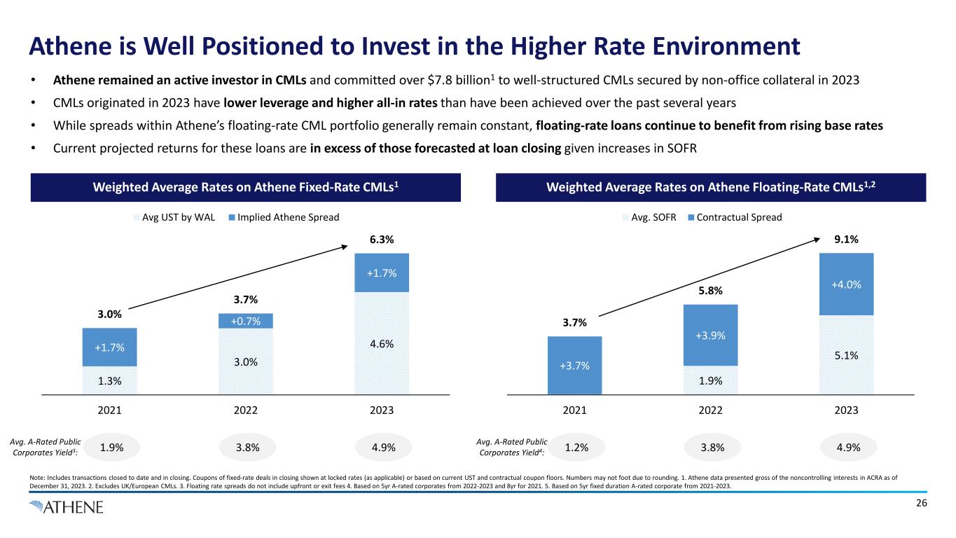 Highly Rated CML Portfolio; ‘CM3’ Designations Driven by Idiosyncratic Factors Note: Athene data presented net of the noncontrolling interests in ACRA as of December 31, 2023. 1. Weighted average LTV figures based on original appraised values at close or most recent appraisal. 25 • Athene’s CML portfolio is nearly 80% rated as CM1 and CM2 • Most of Athene’s CM3 loans have idiosyncratic features that are penalized under the CML framework • For example, mezzanine loans are notched down from 1st lien from where their LTV / DSCR would otherwise apply, and certain specialty real estate types (i.e. parking garages and production studios) are subject to lower LTV / Higher DSCR targets for equivalent CM designations • CM3 loans are still viewed as high quality, since they carry a lower capital requirement than the comparable NAIC 3 bucket for corporate bonds 60% Wtd. Avg LTV1 77% CM1 & CM2 Expected to migrate to CM2 within 12-24 months, upon expected stabilization or achievement of sponsor’s business plan Subject to a more stringent grid of LTV and DSCR than standard CML types due to specialty nature Credit quality of CM2, but rated CM3 due to structure 46% 28% 26% $26 Billion 3 CM3 CompositionDistribution of CMLs by Rating CM1 17% CM2 60% CM3 21% CM4 2% CM5-7 <1%
