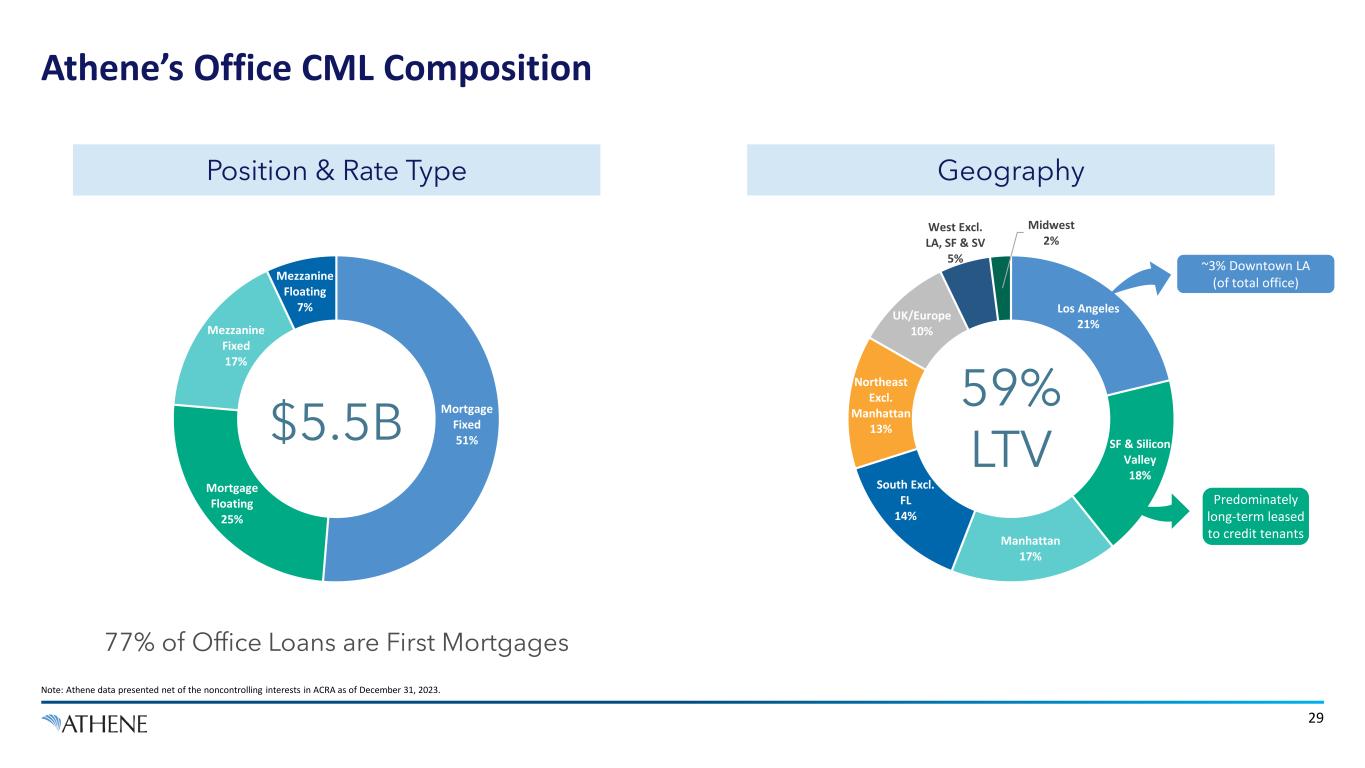 Class A CBD 76% Class B CBD 11% Suburban 10% Medical Office 3% Owner Occupied <1% Athene’s CML Office Investments are 100% Debt Note: Athene data presented net of the noncontrolling interests in ACRA as of December 31, 2023. 1. DSCR is calculated based on interest rate cap. 2. LTV figures based on original appraised values at close or most recent appraisal 3. CBD “Central Business District”. 28 Strong Credit Metrics and Structure 77% First Mortgage 1.9x Debt Service Coverage Ratio1 59% Weighted Avg LTV2 66% CM-1&2 30% CM-3 Proactive Asset Management Focus 62% leased to long-term credit-tenants with ~8 yr. wtd. avg. remaining lease term Office Portfolio Attributes Office Portfolio Composition $5.5B 3 59% 1st mortgage 61% mezzanine ~56% LTV 57% LTV, $12mm avg. loan size, Well-seasoned Concentrated in Loans with Class A Assets and Long- Term Leases 3