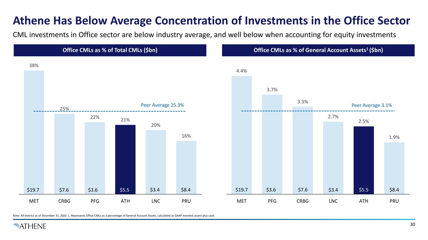 Los Angeles 21% SF & Silicon Valley 18% Manhattan 17% South Excl. FL 14% Northeast Excl. Manhattan 13% UK/Europe 10% West Excl. LA, SF & SV 5% Midwest 2% 59% LTV Mortgage Fixed 51% Mortgage Floating 25% Mezzanine Fixed 17% Mezzanine Floating 7% Athene’s Office CML Composition Note: Athene data presented net of the noncontrolling interests in ACRA as of December 31, 2023. 29 ~3% Downtown LA (of total office) 77% of Office Loans are First Mortgages $5.5B Position & Rate Type Geography Predominately long-term leased to credit tenants