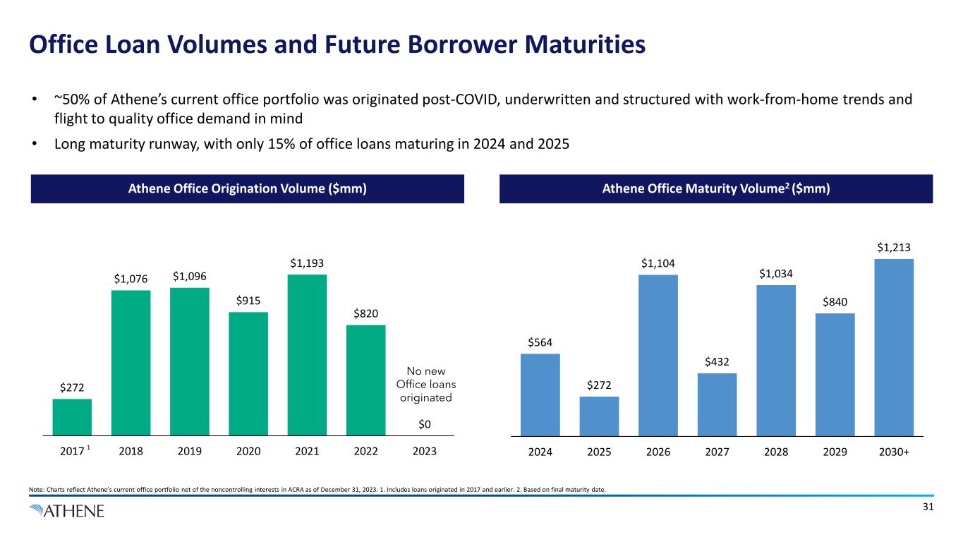 4.4% 3.7% 3.3% 2.7% 2.5% 1.9% Peer Average 3.1% MET PFG CRBG LNC ATH PRU 38% 25% 22% 21% 20% 16% Peer Average 25.3% MET CRBG PFG ATH LNC PRU Athene Has Below Average Concentration of Investments in the Office Sector Note: All metrics as of December 31, 2023. 1. Represents Office CMLs as a percentage of General Account Assets, calculated as GAAP invested assets plus cash. 30 Office CMLs as % of Total CMLs ($bn) Office CMLs as % of General Account Assets1 ($bn) CML investments in Office sector are below industry average, and well below when accounting for equity investments $19.7 $7.6 $3.6 $5.9 $5.5 $3.4 $8.4 $19.7 $3.6 $7.6 $3.4 $5.5 $8.4