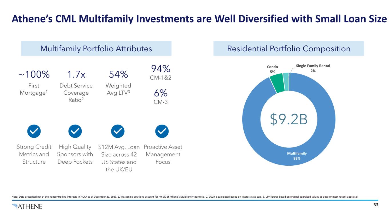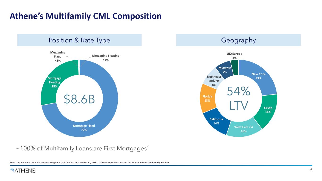 Athene’s CML Multifamily Investments are Well Diversified with Small Loan Size Note: Data presented net of the noncontrolling interests in ACRA as of December 31, 2023. 1. Mezzanine positions account for ~0.1% of Athene’s Multifamily portfolio. 2. DSCR is calculated based on interest rate cap. 3. LTV figures based on original appraised values at close or most recent appraisal. 33 Strong Credit Metrics and Structure ~100% First Mortgage1 1.7x Debt Service Coverage Ratio2 54% Weighted Avg LTV3 94% CM-1&2 6% CM-3 High Quality Sponsors with Deep Pockets Proactive Asset Management Focus Multifamily Portfolio Attributes Residential Portfolio Composition 3 3 Multifamily 93% Condo 5% Single Family Rental 2% $9.2B $12M Avg. Loan Size across 42 US States and the UK/EU
