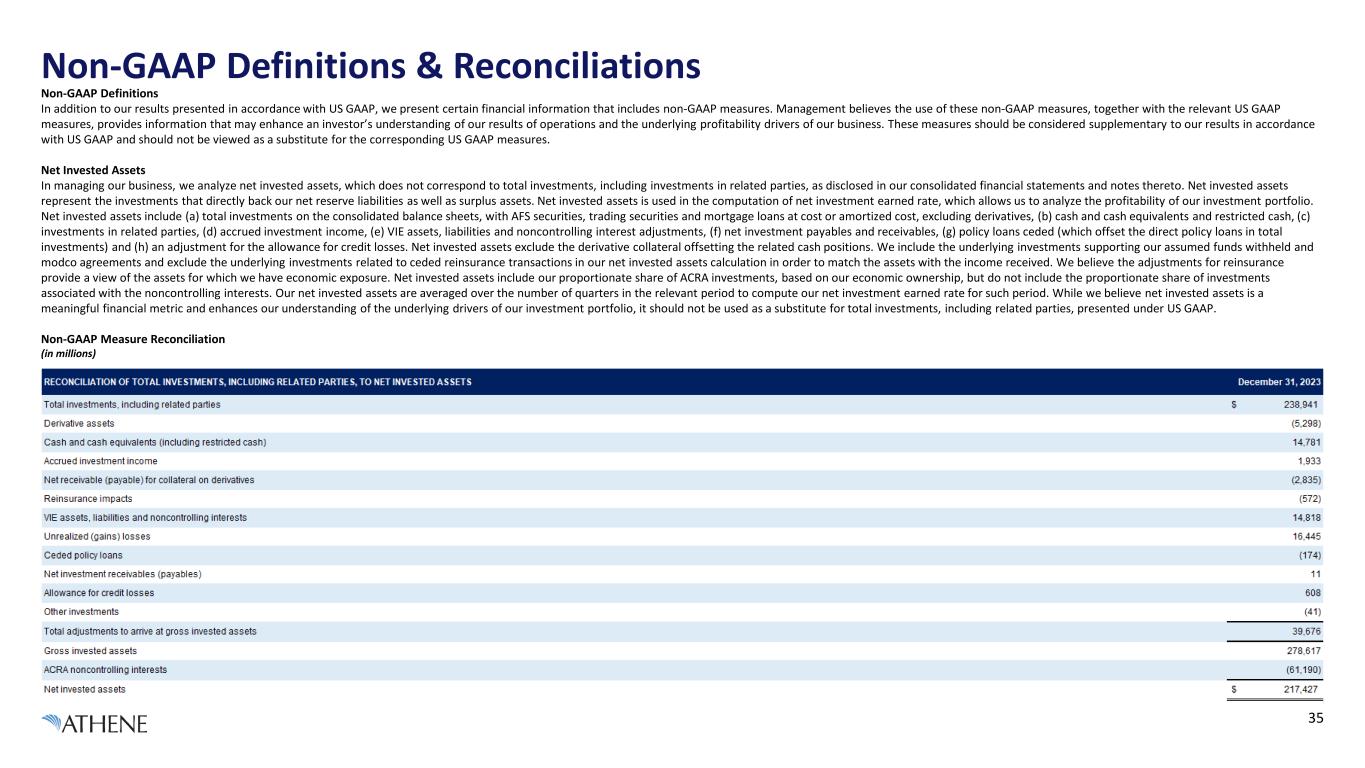 Non-GAAP Definitions & Reconciliations 35 Non-GAAP Definitions In addition to our results presented in accordance with US GAAP, we present certain financial information that includes non-GAAP measures. Management believes the use of these non-GAAP measures, together with the relevant US GAAP measures, provides information that may enhance an investor’s understanding of our results of operations and the underlying profitability drivers of our business. These measures should be considered supplementary to our results in accordance with US GAAP and should not be viewed as a substitute for the corresponding US GAAP measures. Net Invested Assets In managing our business, we analyze net invested assets, which does not correspond to total investments, including investments in related parties, as disclosed in our consolidated financial statements and notes thereto. Net invested assets represent the investments that directly back our net reserve liabilities as well as surplus assets. Net invested assets is used in the computation of net investment earned rate, which allows us to analyze the profitability of our investment portfolio. Net invested assets include (a) total investments on the consolidated balance sheets, with AFS securities, trading securities and mortgage loans at cost or amortized cost, excluding derivatives, (b) cash and cash equivalents and restricted cash, (c) investments in related parties, (d) accrued investment income, (e) VIE assets, liabilities and noncontrolling interest adjustments, (f) net investment payables and receivables, (g) policy loans ceded (which offset the direct policy loans in total investments) and (h) an adjustment for the allowance for credit losses. Net invested assets exclude the derivative collateral offsetting the related cash positions. We include the underlying investments supporting our assumed funds withheld and modco agreements and exclude the underlying investments related to ceded reinsurance transactions in our net invested assets calculation in order to match the assets with the income received. We believe the adjustments for reinsurance provide a view of the assets for which we have economic exposure. Net invested assets include our proportionate share of ACRA investments, based on our economic ownership, but do not include the proportionate share of investments associated with the noncontrolling interests. Our net invested assets are averaged over the number of quarters in the relevant period to compute our net investment earned rate for such period. While we believe net invested assets is a meaningful financial metric and enhances our understanding of the underlying drivers of our investment portfolio, it should not be used as a substitute for total investments, including related parties, presented under US GAAP. Non-GAAP Measure Reconciliation (in millions)