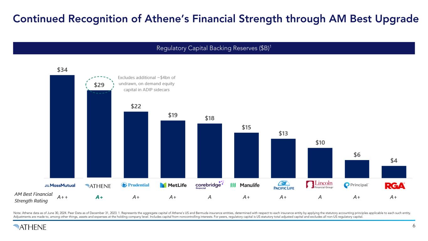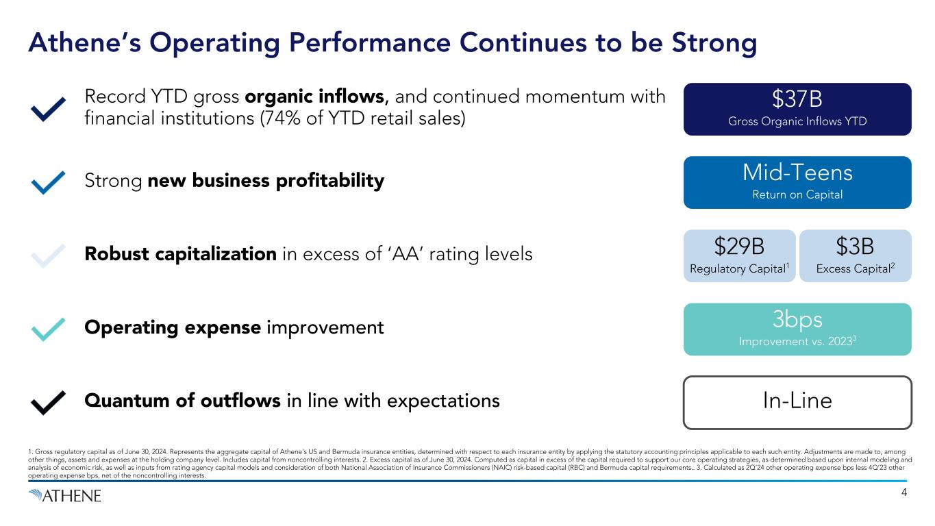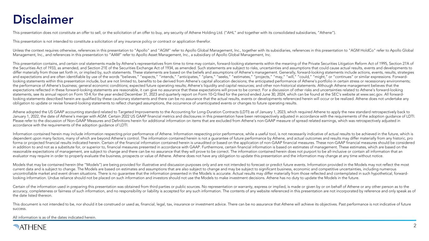 Disclaimer This presentation does not constitute an offer to sell, or the solicitation of an offer to buy, any security of Athene Holding Ltd. (“AHL” and together with its consolidated subsidiaries, “Athene”). This presentation is not intended to constitute a solicitation of any insurance policy or contract or application therefor. Unless the context requires otherwise, references in this presentation to “Apollo" and "AGM" refer to Apollo Global Management, Inc., together with its subsidiaries, references in this presentation to "AGM HoldCo" refer to Apollo Global Management, Inc., and references in this presentation to “AAM” refer to Apollo Asset Management, Inc., a subsidiary of Apollo Global Management, Inc. This presentation contains, and certain oral statements made by Athene’s representatives from time to time may contain, forward-looking statements within the meaning of the Private Securities Litigation Reform Act of 1995, Section 27A of the Securities Act of 1933, as amended, and Section 21E of the Securities Exchange Act of 1934, as amended. Such statements are subject to risks, uncertainties and assumptions that could cause actual results, events and developments to differ materially from those set forth in, or implied by, such statements. These statements are based on the beliefs and assumptions of Athene’s management. Generally, forward-looking statements include actions, events, results, strategies and expectations and are often identifiable by use of the words “believes,” “expects,” “intends,” “anticipates,” “plans,” “seeks,” “estimates,” “projects,” “may,” “will,” “could,” “might,” or “continues” or similar expressions. Forward- looking statements within this presentation include, but are not limited to, benefits to be derived from Athene's capital allocation decisions; the anticipated performance of Athene's portfolio in certain stress or recessionary environments; the performance of Athene's business; general economic conditions; expected future operating results; Athene's liquidity and capital resources; and other non-historical statements. Although Athene management believes that the expectations reflected in these forward-looking statements are reasonable, it can give no assurance that these expectations will prove to be correct. For a discussion of other risks and uncertainties related to Athene's forward-looking statements, see its annual report on Form 10-K for the year ended December 31, 2023 and quarterly report on Form 10-Q filed for the period ended June 30, 2024, which can be found at the SEC’s website at www.sec.gov. All forward- looking statements described herein are qualified by these cautionary statements and there can be no assurance that the actual results, events or developments referenced herein will occur or be realized. Athene does not undertake any obligation to update or revise forward-looking statements to reflect changed assumptions, the occurrence of unanticipated events or changes to future operating results. Athene adopted the US GAAP accounting standard related to Targeted Improvements to the Accounting for Long-Duration Contracts (LDTI) as of January 1, 2023, which required Athene to apply the new standard retrospectively back to January 1, 2022, the date of Athene’s merger with AGM. Certain 2022 US GAAP financial metrics and disclosures in this presentation have been retrospectively adjusted in accordance with the requirements of the adoption guidance of LDTI. Please refer to the discussion of Non-GAAP Measures and Definitions herein for additional information on items that are excluded from Athene’s non-GAAP measure of spread related earnings, which was retrospectively adjusted in accordance with the requirements of the adoption guidance of LDTI. Information contained herein may include information respecting prior performance of Athene. Information respecting prior performance, while a useful tool, is not necessarily indicative of actual results to be achieved in the future, which is dependent upon many factors, many of which are beyond Athene's control. The information contained herein is not a guarantee of future performance by Athene, and actual outcomes and results may differ materially from any historic, pro forma or projected financial results indicated herein. Certain of the financial information contained herein is unaudited or based on the application of non-GAAP financial measures. These non-GAAP financial measures should be considered in addition to and not as a substitute for, or superior to, financial measures presented in accordance with GAAP. Furthermore, certain financial information is based on estimates of management. These estimates, which are based on the reasonable expectations of management, are subject to change and there can be no assurance that they will prove to be correct. The information contained herein does not purport to be all-inclusive or contain all information that an evaluator may require in order to properly evaluate the business, prospects or value of Athene. Athene does not have any obligation to update this presentation and the information may change at any time without notice. Models that may be contained herein (the “Models”) are being provided for illustrative and discussion purposes only and are not intended to forecast or predict future events. Information provided in the Models may not reflect the most current data and is subject to change. The Models are based on estimates and assumptions that are also subject to change and may be subject to significant business, economic and competitive uncertainties, including numerous uncontrollable market and event driven situations. There is no guarantee that the information presented in the Models is accurate. Actual results may differ materially from those reflected and contemplated in such hypothetical, forward- looking information. Undue reliance should not be placed o
