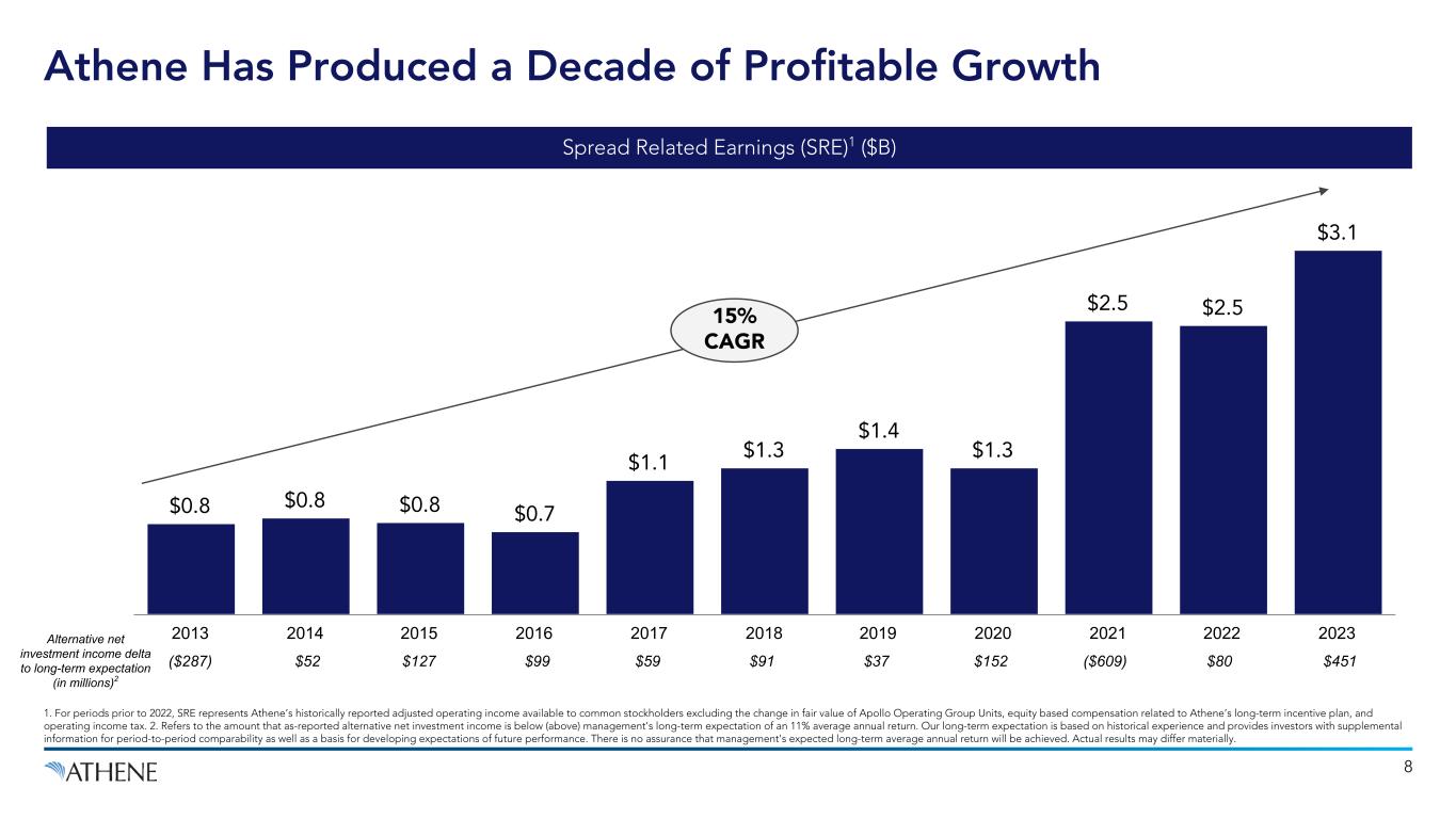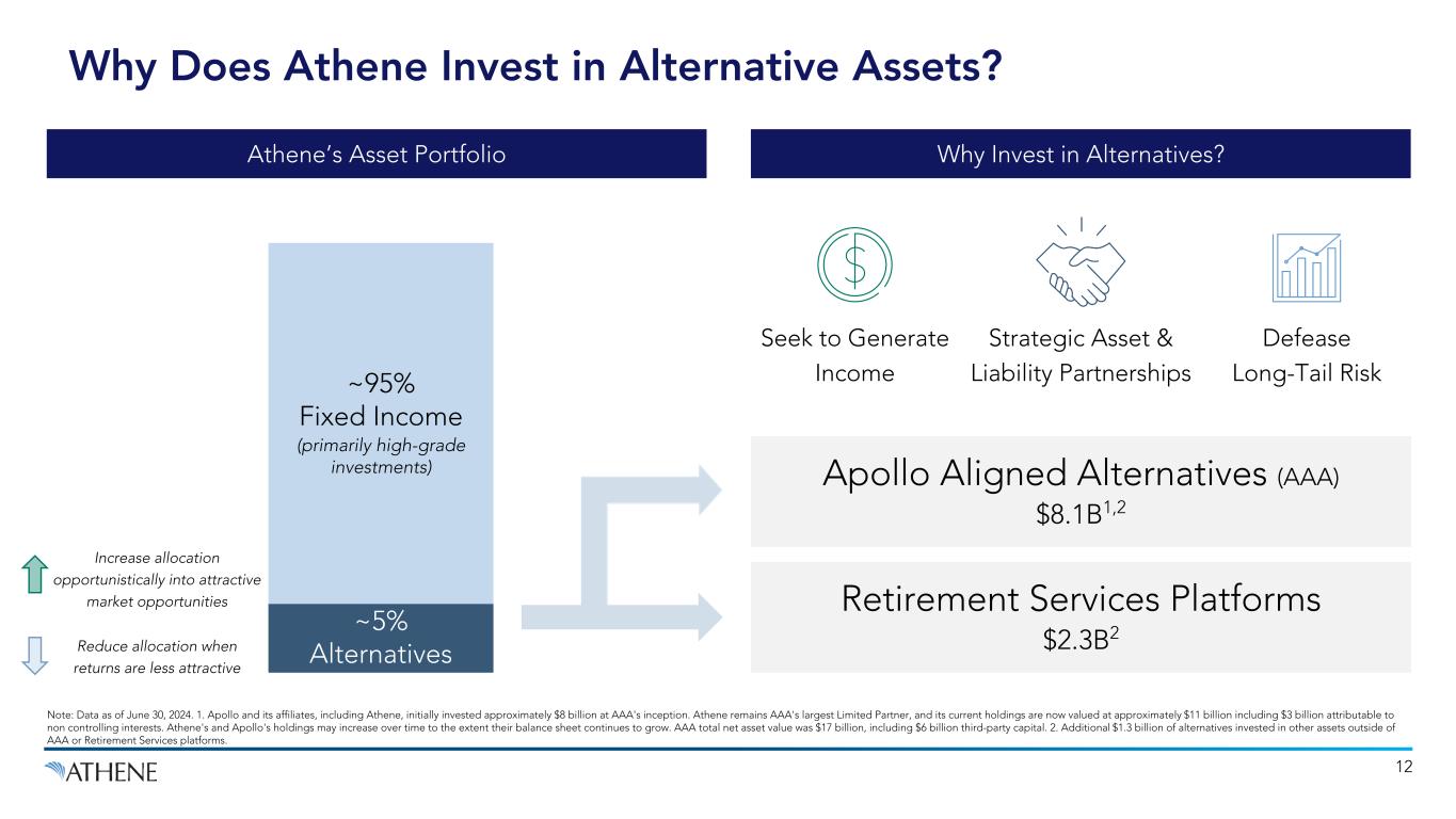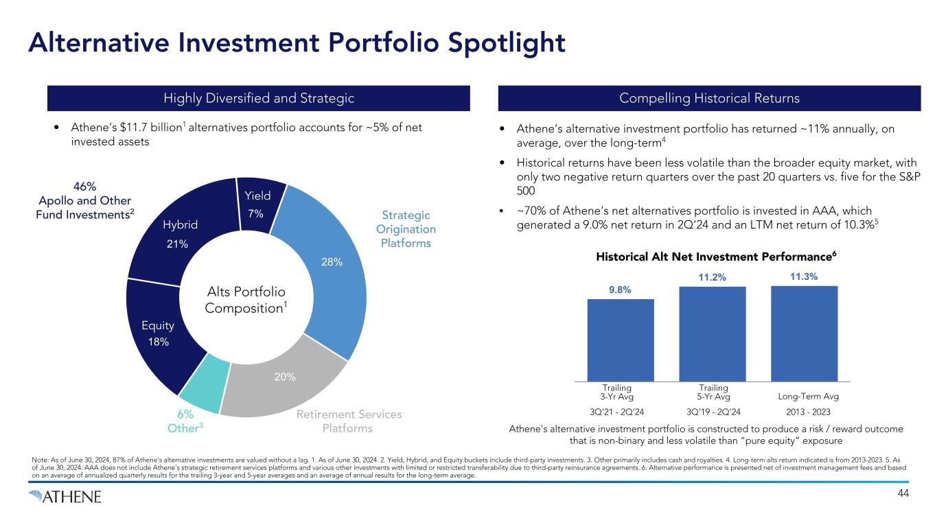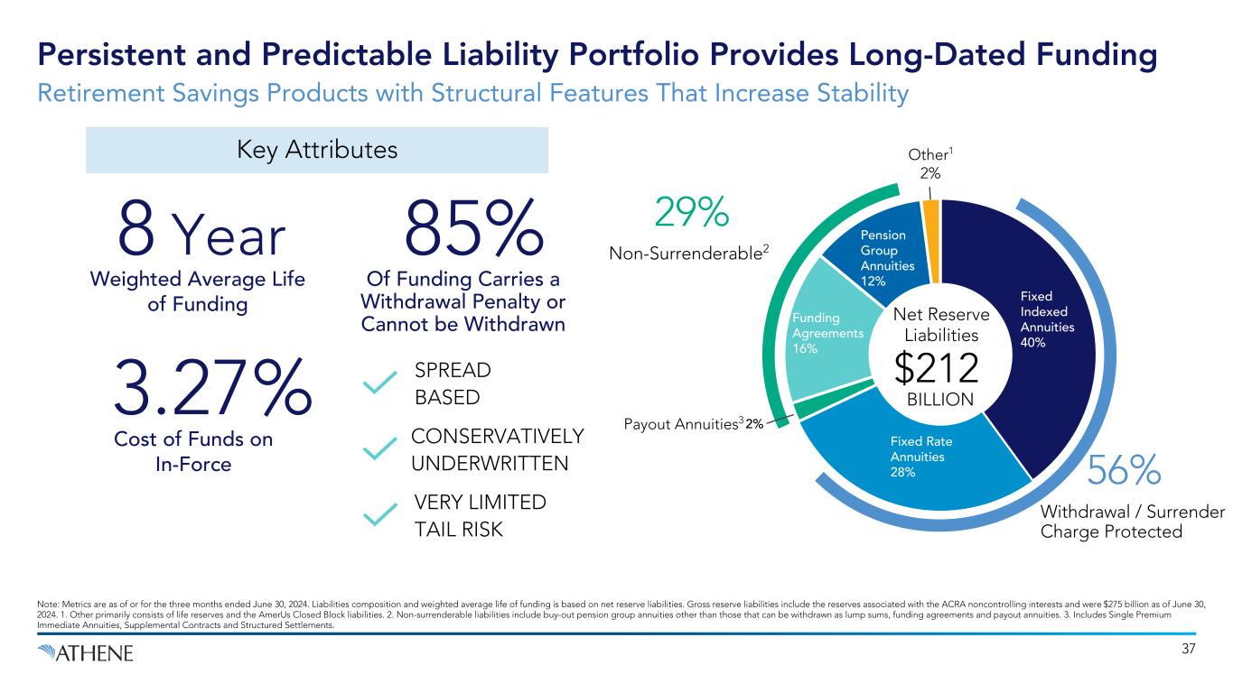 Disclaimer This presentation does not constitute an offer to sell, or the solicitation of an offer to buy, any security of Athene Holding Ltd. (“AHL” and together with its consolidated subsidiaries, “Athene”). This presentation is not intended to constitute a solicitation of any insurance policy or contract or application therefor. Unless the context requires otherwise, references in this presentation to “Apollo" and "AGM" refer to Apollo Global Management, Inc., together with its subsidiaries, references in this presentation to "AGM HoldCo" refer to Apollo Global Management, Inc., and references in this presentation to “AAM” refer to Apollo Asset Management, Inc., a subsidiary of Apollo Global Management, Inc. This presentation contains, and certain oral statements made by Athene’s representatives from time to time may contain, forward-looking statements within the meaning of the Private Securities Litigation Reform Act of 1995, Section 27A of the Securities Act of 1933, as amended, and Section 21E of the Securities Exchange Act of 1934, as amended. Such statements are subject to risks, uncertainties and assumptions that could cause actual results, events and developments to differ materially from those set forth in, or implied by, such statements. These statements are based on the beliefs and assumptions of Athene’s management. Generally, forward-looking statements include actions, events, results, strategies and expectations and are often identifiable by use of the words “believes,” “expects,” “intends,” “anticipates,” “plans,” “seeks,” “estimates,” “projects,” “may,” “will,” “could,” “might,” or “continues” or similar expressions. Forward- looking statements within this presentation include, but are not limited to, benefits to be derived from Athene's capital allocation decisions; the anticipated performance of Athene's portfolio in certain stress or recessionary environments; the performance of Athene's business; general economic conditions; expected future operating results; Athene's liquidity and capital resources; and other non-historical statements. Although Athene management believes that the expectations reflected in these forward-looking statements are reasonable, it can give no assurance that these expectations will prove to be correct. For a discussion of other risks and uncertainties related to Athene's forward-looking statements, see its annual report on Form 10-K for the year ended December 31, 2023 and quarterly report on Form 10-Q filed for the period ended June 30, 2024, which can be found at the SEC’s website at www.sec.gov. All forward- looking statements described herein are qualified by these cautionary statements and there can be no assurance that the actual results, events or developments referenced herein will occur or be realized. Athene does not undertake any obligation to update or revise forward-looking statements to reflect changed assumptions, the occurrence of unanticipated events or changes to future operating results. Athene adopted the US GAAP accounting standard related to Targeted Improvements to the Accounting for Long-Duration Contracts (LDTI) as of January 1, 2023, which required Athene to apply the new standard retrospectively back to January 1, 2022, the date of Athene’s merger with AGM. Certain 2022 US GAAP financial metrics and disclosures in this presentation have been retrospectively adjusted in accordance with the requirements of the adoption guidance of LDTI. Please refer to the discussion of Non-GAAP Measures and Definitions herein for additional information on items that are excluded from Athene’s non-GAAP measure of spread related earnings, which was retrospectively adjusted in accordance with the requirements of the adoption guidance of LDTI. Information contained herein may include information respecting prior performance of Athene. Information respecting prior performance, while a useful tool, is not necessarily indicative of actual results to be achieved in the future, which is dependent upon many factors, many of which are beyond Athene's control. The information contained herein is not a guarantee of future performance by Athene, and actual outcomes and results may differ materially from any historic, pro forma or projected financial results indicated herein. Certain of the financial information contained herein is unaudited or based on the application of non-GAAP financial measures. These non-GAAP financial measures should be considered in addition to and not as a substitute for, or superior to, financial measures presented in accordance with GAAP. Furthermore, certain financial information is based on estimates of management. These estimates, which are based on the reasonable expectations of management, are subject to change and there can be no assurance that they will prove to be correct. The information contained herein does not purport to be all-inclusive or contain all information that an evaluator may require in order to properly evaluate the business, prospects or value of Athene. Athene does not have any obligation to update this presentation and the information may change at any time without notice. Models that may be contained herein (the “Models”) are being provided for illustrative and discussion purposes only and are not intended to forecast or predict future events. Information provided in the Models may not reflect the most current data and is subject to change. The Models are based on estimates and assumptions that are also subject to change and may be subject to significant business, economic and competitive uncertainties, including numerous uncontrollable market and event driven situations. There is no guarantee that the information presented in the Models is accurate. Actual results may differ materially from those reflected and contemplated in such hypothetical, forward- looking information. Undue reliance should not be placed o