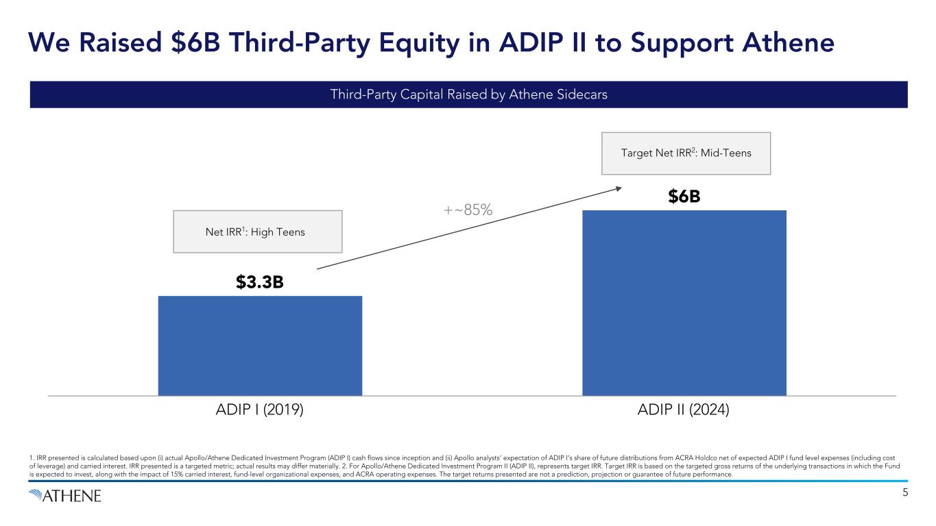 Record YTD gross organic inflows, and continued momentum with financial institutions (74% of YTD retail sales) Strong new business profitability Robust capitalization in excess of ‘AA’ rating levels Operating expense improvement Quantum of outflows in line with expectations 4 Athene’s Operating Performance Continues to be Strong 1. Gross regulatory capital as of June 30, 2024. Represents the aggregate capital of Athene's US and Bermuda insurance entities, determined with respect to each insurance entity by applying the statutory accounting principles applicable to each such entity. Adjustments are made to, among other things, assets and expenses at the holding company level. Includes capital from noncontrolling interests. 2. Excess capital as of June 30, 2024. Computed as capital in excess of the capital required to support our core operating strategies, as determined based upon internal modeling and analysis of economic risk, as well as inputs from rating agency capital models and consideration of both National Association of Insurance Commissioners (NAIC) risk-based capital (RBC) and Bermuda capital requirements.. 3. Calculated as 2Q’24 other operating expense bps less 4Q’23 other operating expense bps, net of the noncontrolling interests. $37B Gross Organic Inflows YTD Mid-Teens Return on Capital 3bps Improvement vs. 20233 In-Line $3B Excess Capital2 $29B Regulatory Capital1
