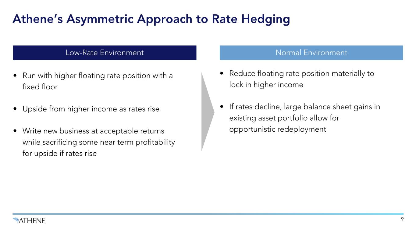 Low-Rate Environment Normal Environment • Run with higher floating rate position with a fixed floor • Upside from higher income as rates rise • Write new business at acceptable returns while sacrificing some near term profitability for upside if rates rise • Reduce floating rate position materially to lock in higher income • If rates decline, large balance sheet gains in existing asset portfolio allow for opportunistic redeployment 9 Athene’s Asymmetric Approach to Rate Hedging